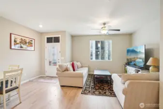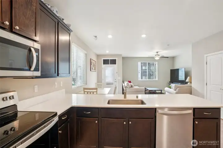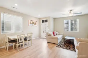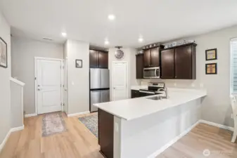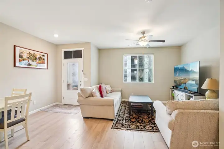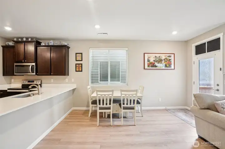 Make a great first impression with the open and spacious entertaining areas of this townhome. The huge kitchen is upgraded with stainless steel appliances, polished quartz countertops and 42-inch upper cabinets. Stylish plank flooring flows from the expansive great room to the large dining room and kitchen. Upstairs, relax in the private owner's retreat or one of the additional three bedrooms. A large secondary bathroom and laundry room are also located upstairs. Fenced front yard; spacious 2-car garage & additional parking.