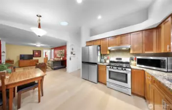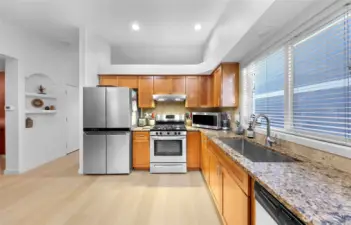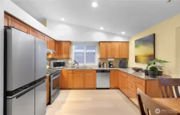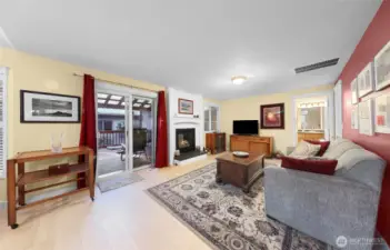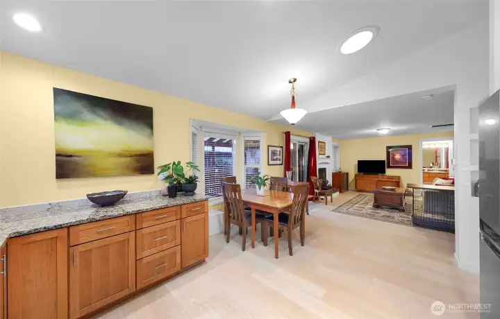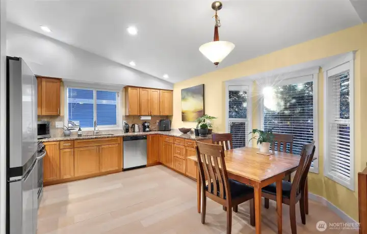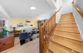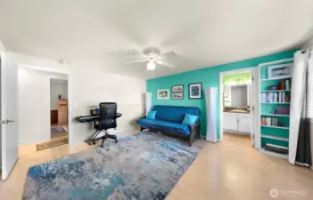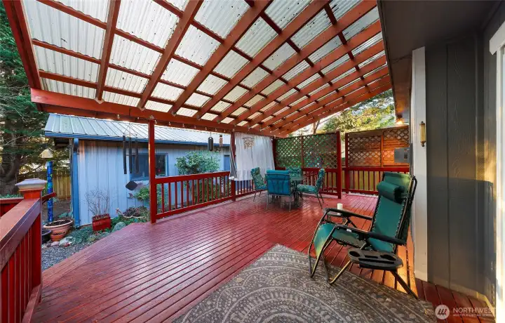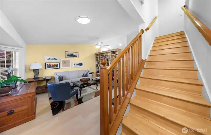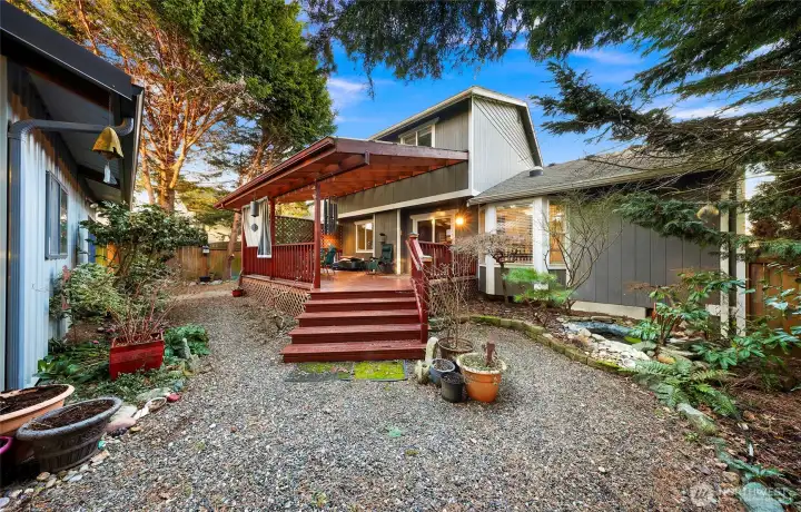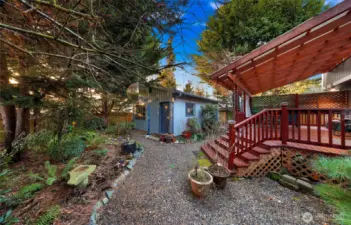 Step into this inviting home filled with charm, character, and thoughtful upgrades. The living room greets you with custom built-ins, while the family room invites you to unwind beside the gas fireplace. Enjoy the beautifully refreshed kitchen with quartz counters, cherry cabinetry, new vinyl plank flooring and new modern appliances. Half of the 2-car garage is transformed into a bright studio with a north facing window, perfect for art, music, or quiet focus. Prefer a full garage? It can easily be converted back. As you continue upstairs, notice the stunning reclaimed wood railing, salvaged from an old school exuding precious history. The three (3) generous bedrooms offer comfort and flexibility, master with full bathroom and a 2nd full bathroom at end of hallway. Step outside onto a spacious covered deck overlooking a peaceful, maturely landscaped backyard with a small pond, all creating your own private retreat. The 16'X24' bonus building adds even more opportunity whether you envision an ADU, guest suite, workshop, or creative studio. Included is a small water heater, 220 electric outlet, separate fuse box, sink, and thermostated heat, all properly permitted. This beauty-filled home sits in a no outlet neighborhood (limited traffic) with easy access to the Inner Urban Trail system, making this a wonder-filled place to live, explore, and create.