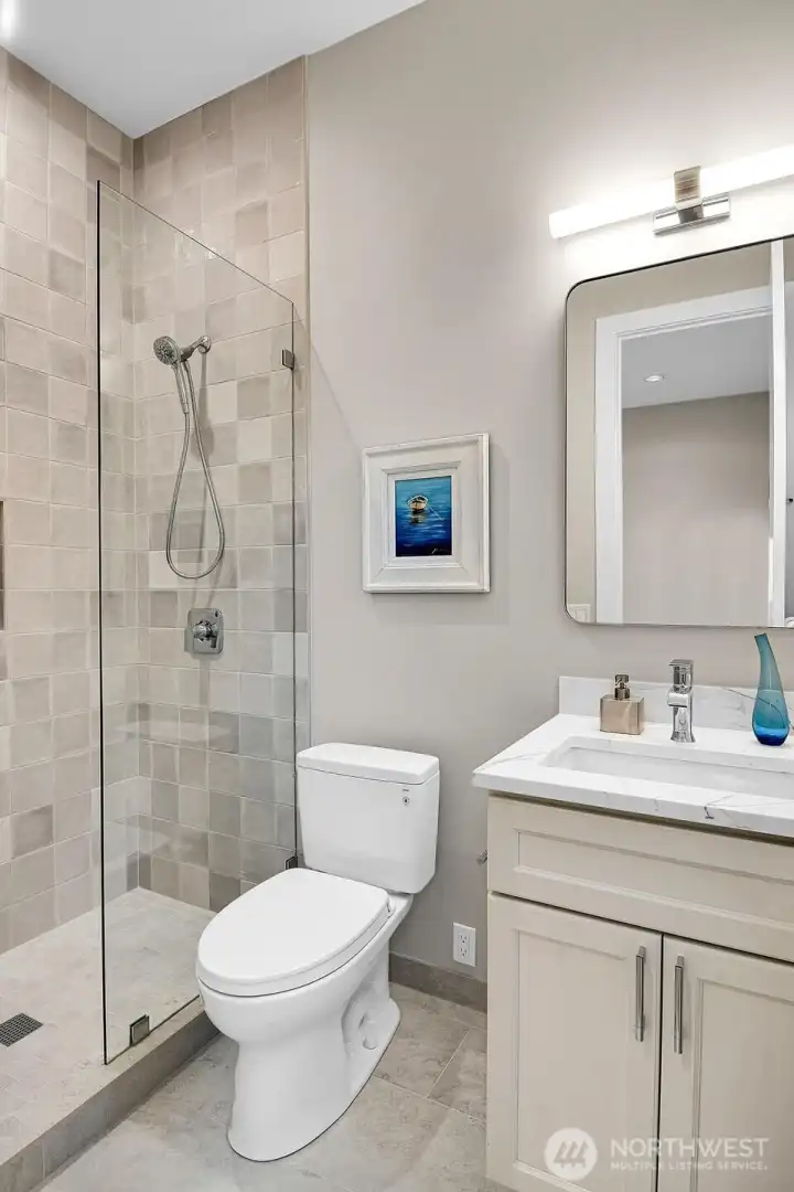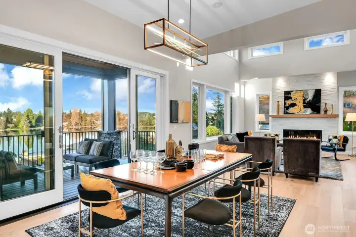Rare opportunity to own a NEW Northwest Contemporary masterpiece with elevated lake and territorial views of Lake Burien. Located in a private, gated enclave of 4 custom homes, enjoy swimming, paddle boarding and fishing via shared easement access to the 44-acre private lake. Spanning 4,492 sq ft of modern living, the home features soaring 16’ ceilings, expansive windows and a design for grand entertaining. The great room boasts a sleek alabaster stone fireplace, while the dining area includes a wet bar leading to a dry Trex deck with a PNW inspired wood-lined ceiling. A chef’s gourmet kitchen is equipped with GE Café appliances, including a 6-burner range, double ovens, oversized quartz island, prep sink, walk-in pantry and coffee station. The main-level primary suite offers a spa-inspired 5-piece bath with heated floors and walk-in closet. Also on the main: a private office (or 5th BR), junior suite, laundry/mudroom and 3-car garage with Level 2 EV charging. The lower level (w/ 10' ceilings) provides incredible flexibility for guests or multi-generational living with a 2nd primary suite (5-piece bath/walk-in closet), large living room, kitchenette, media room with wet bar/cinema lighting, gym, wine/podcast space and 4th BR. Outdoor living includes a dry covered patio with a dual-sided fireplace & hot-tub hookups (perfect after a dip in the lake). Minutes to Sea-Tac, Seattle & Tacoma. Walking distance to St. Francis School & Olde Burien. Experience luxury lakeside living!