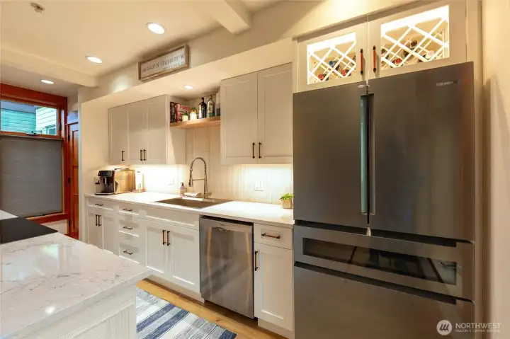Live where the action is in the vibrant core of Friday Harbor! Just steps to the marina, ferry, restaurants, and shopping, this beautifully remodeled 1,628 sq ft condo offers the perfect blend of luxury, comfort, and convenience. Nightly rentals are allowed in the complex. Enjoy views of the harbor, ferry arrivals, seaplanes, and boating activity from the roof top deck. The open-concept living space features a dramatic floor-to-ceiling marble tile propane fireplace and abundant natural light. The chef’s kitchen is designed to impress with stainless steel Bosch appliances, induction range, generous eat-in island, quartz countertops, and marble backsplash. Two spacious bedrooms and two full baths include a stunning primary suite with vaulted ceilings, spa-inspired 5-piece bath with dual sinks and soaking tub, and a walk-in closet with custom built-ins. Mini-split heat & A/C ensure year-round comfort. The unit was completely remodeled in 2022 with new flooring, carpets, appliances, kitchen cabinets, countertops, lighting fixtures, a marble tiled fireplace, bidet toilet, and decking on both decks. Secure coded entry, elevator access, and dedicated parking for your island car in a secure garage provide convenience and peace of mind. Move-in ready including furniture, and perfectly positioned in the heart of San Juan Island — enjoy effortless island living with harbor views. As the unit can be a VRBO, you can enjoy your tax advantages as well as some personal use.