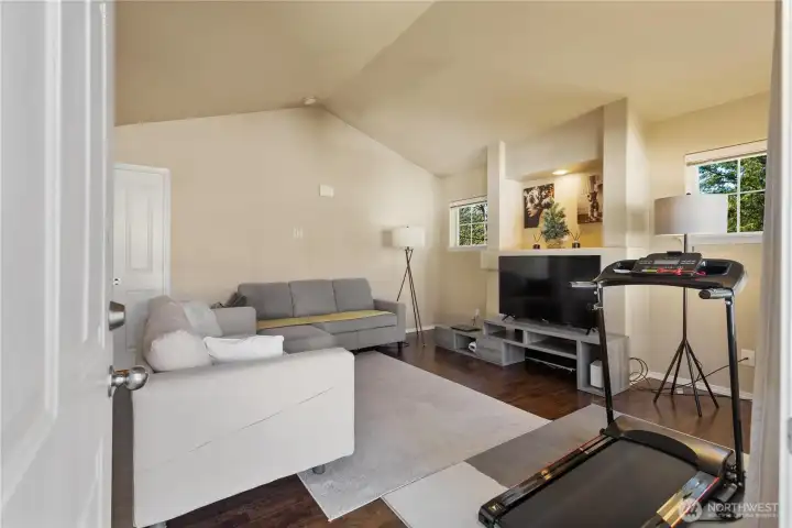 Ideally located in one of the most walkable and convenient areas of the community, this bright and inviting home offers exceptional privacy and comfort. With its own private entrance and durable composition roof, the home features two bedrooms and two bathrooms. A unique layout allows the interior door to be closed, creating two private primary-style suites—perfect for flexible living arrangements. The spacious oversized garage is located below the home, eliminating any concern about noise from below. Additional side outdoor space provides a private retreat, enhancing both privacy and usability. The primary suite easily accommodates a king-sized bedroom set and includes a walk-in closet. Bright, cozy, and meticulously maintained, this home is just a short walk from the town center, scenic trails, Clock Tower Park, playgrounds, and local schools When the center door is closed, the layout functions as two primary suites.