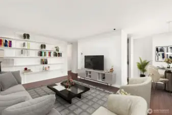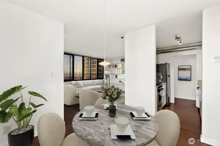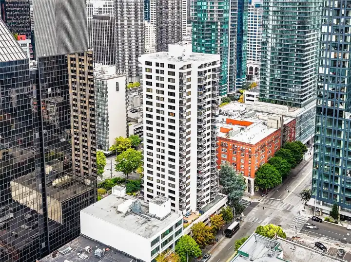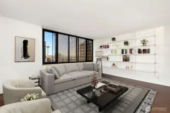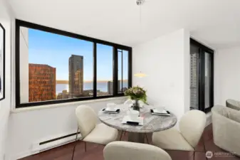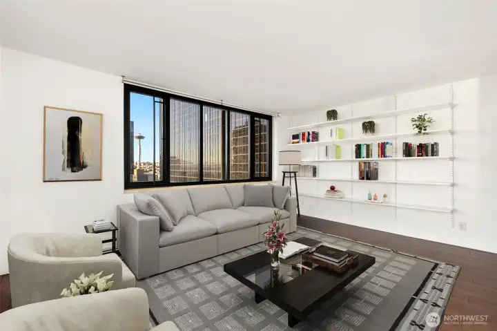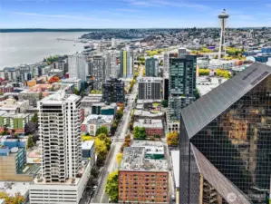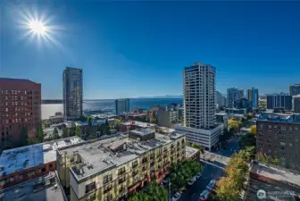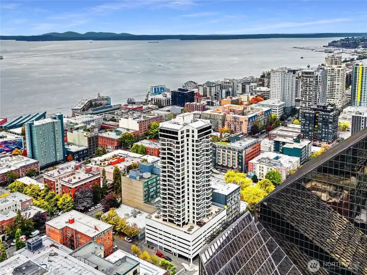 Magnificent views of Elliott Bay, the Olympics, and Space Needle from this 2 bedroom, 1.75 bath corner unit in Belltown. Expansive windows and a covered balcony overlook the water and cityscape. Renovated kitchen with quartz counters and stainless steel appliances. Updated bathrooms feature new tile and fixtures. Primary suite with NW views, walk-in closet and ensuite bath. The second bedroom enjoys water, mountain, and Space Needle views—perfect as a study or guest room. Freshly painted with custom bookshelves. Amenities include outdoor pool, fitness room w/ sauna, community kitchen, BBQs, Amazon lockers, on-site manager & more. Deeded, secure garage parking w/ EV charging. HOA covers all utilities & earthquake insurance. Steps to Pike Place Market, transit, dining, shopping, and the waterfront. Walk Score 99 / Transit 100!