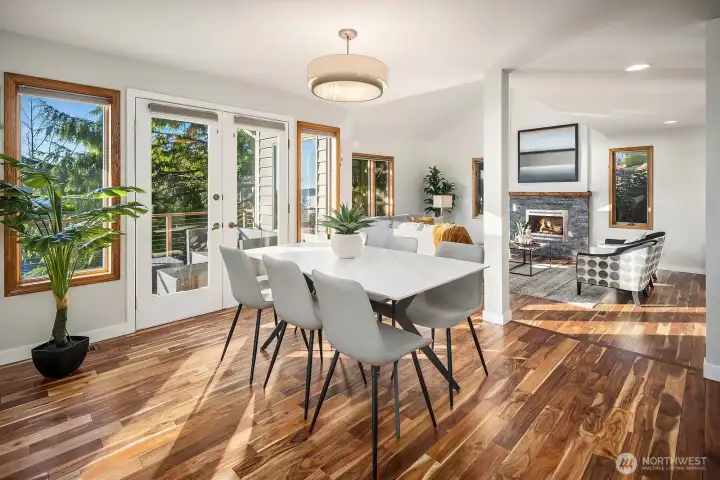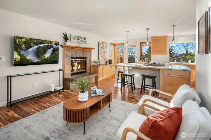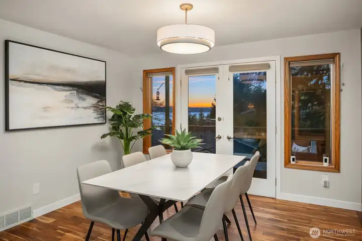 Enjoy amazing sunsets and sound VIEWS from this beautiful NW Contemporary in an idyllic location on a quiet, non-thru street with the Thistle Steps leading you to the Fauntleroy Ferry dock and the verdant trails of Lincoln park. Extensive recent updates include a new furnace and air conditioning, acacia hardwood floors throughout the main and upper levels, lighting, stair railings, main living room fireplace surround, and renovated kitchen. Flexible extra room on main level could be 4th bedroom, home office, gym, studio. Cooking and entertaining with spacious kitchen island with bar seating opening to family room and fireplace, viking range, double oven, and stainless steel appliances. Ample 2 car garage parking, plus room for 3 cars off street. Sound views and easy access to your west facing back decks. Your primary suite enjoys its own fireplace, sweeping water views, and private deck. Vaulted ceiling and skylights adds tons of natural light. Welcome Home!