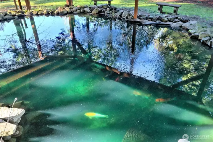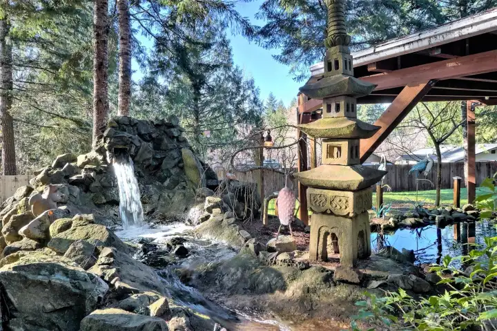This place is really cool... 3 bedrooms, 2 baths with a great floorplan! The galley style kitchen has a ton of cabinetry and counter space with all of the appliances included (the range is brand new) plus... a really big walk-in pantry with more counterspace!. There is a nice corner breakfast nook that looks out over the garden area, a great utility/mudroom for coming in from the yard, and a really nice primary suite that is seperated from the other two bedrooms. The dining room has a propane stove and the living room has a wood stove so you should never be cold! There is a HUGE, totally covered deck out back that opens to the yard, a covered Koi pond (complete with fish), a waterfall and the goat barn if you are so inclined. The 1+ acre parcel is all fenced and it is a very private setting. Lots of storage in the outbuilding and the big 2 car attached garage with shop space. When it blooms... this property is very beautiful! Just in time for Spring...