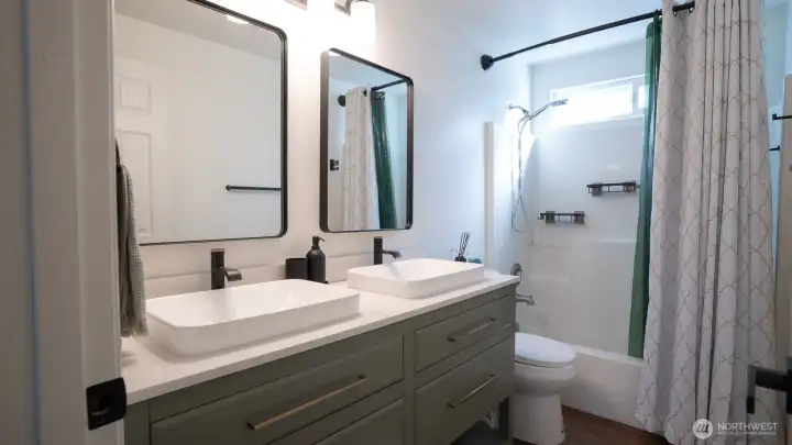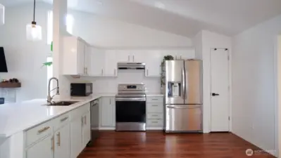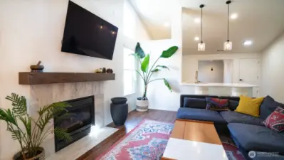 Welcome to this beautifully refreshed and thoughtfully updated home, tucked into a quiet, well-established Vancouver neighborhood where comfort, style, and convenience come together seamlessly. Ideally located near the hospital, highly regarded Vancouver School District schools, and just minutes from the I-205 entrance, this home offers exceptional accessibility for commuting and daily life. Shopping, dining, and everyday essentials along Mill Plain Boulevard are close by, creating the perfect balance of neighborhood tranquility and urban convenience. Recent upgrades provide both value and peace of mind, including a newer shingle roof and a high-tech washer and dryer that enhance efficiency and simplify routines. Step inside to discover a light-filled, spacious living room that flows effortlessly into a generous open-concept kitchen and dining area, all filled with natural sunlight. At the heart of the home is a striking white quartz island with bar seatin, ideal for casual breakfasts, entertaining, or gathering. The kitchen blends style and function with stainless steel appliances, sage green cabinetry, brushed brass accents, sleek black matte hardware, and a separate pantry for added storage. The dining area opens directly to the backyard, creating easy indoor-outdoor living. Warm, modern touches shine throughout, including a cozy gas fireplace with an elegant mantle anchoring the living space.