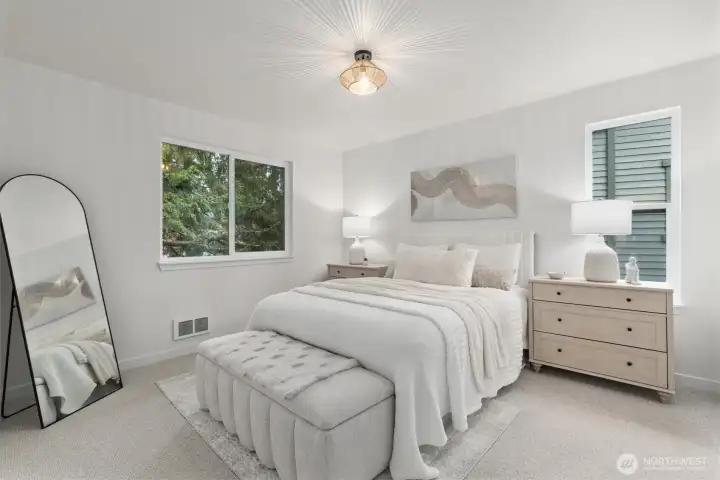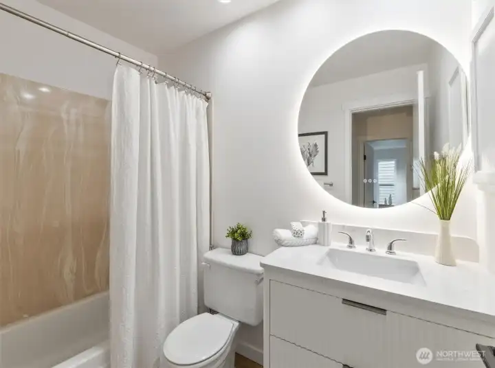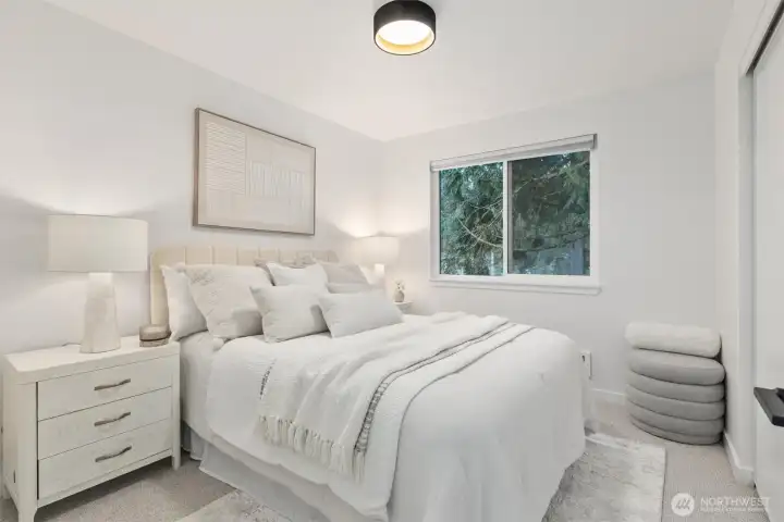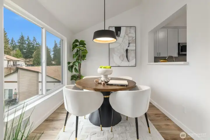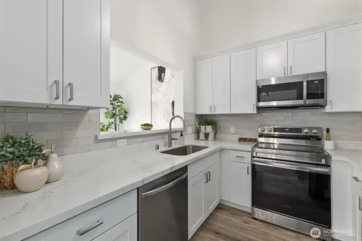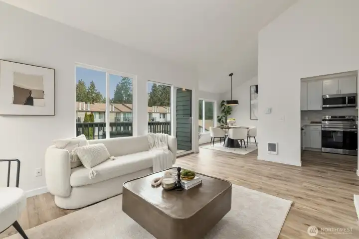 NEW, NEW, NEW! Elevated Living in Stunning Totem Lake Condo! Impressive 2-Bedroom, 2-bathroom TOP-floor unit in the heart of Totem Lake Fully renovated with elevated style and sophistication. The spacious living area features vaulted ceilings, a wood-burning fireplace, and ample natural light. The NEW gourmet kitchen boasts luxe quartz countertops and sleek stainless steel appliances, while the well-appointed bathrooms offer modern style and taste. Enjoy brand-new flooring, plush carpet, fresh interior paint, and stunning designer lighting throughout. Unmatched convenience just blocks from The Village at Totem Lake, Evergreen Hospital, and I-405, this home provides easy access to all amenities! Quite community with pool, hot tub, and strong HOA, all within the Coveted Lake Washington School District, Designated covered parking spot, and ample guest parking.