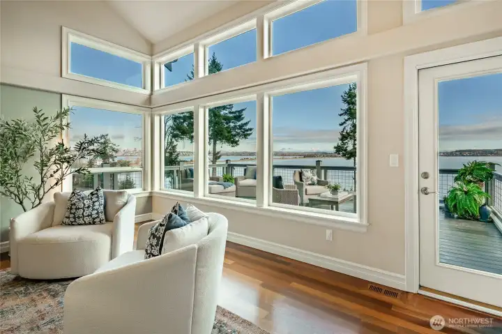 Presenting a rare opportunity to acquire a distinguished waterfront residence in the exclusive, gated enclave of Aerie at Semiahmoo. With just 11 townhomes gracefully positioned across five private acres, this community defines luxury living through privacy, security, & effortless elegance. Sweeping panoramic views extend across the marina & surrounding landscape to majestic Mt. Baker where vibrant sunrises transition into glittering city lights at dusk. Designed for refined main-level living, the home features a chef’s kitchen appointed with Viking Professional appliances, a built-in Miele coffee system, under-counter refrigerator drawers, warming drawer, wine cooler, & exceptional finishes throughout. Rich Brazilian cherry floors lead to a spacious primary suite showcasing dramatic water & mountain views. Hand-selected slate flooring throughout the home lends architectural presence & enduring durability, blending natural beauty with low-maintenance luxury. Maintenance-free decking provides the perfect setting for entertaining while enjoying panoramic views. A covered portion allows for year-round grilling & outdoor enjoyment. Upstairs, a versatile loft/flex space accompanies an ensuite guest retreat with unobstructed water vistas. The lower level offers a generous bonus room, an additional bedroom & bath, a cedar sauna, & flexible space ideal for fitness, hobbies, or media. A well-managed HOA ensures impeccably maintained grounds, enhancing the beauty, value, & prestige.