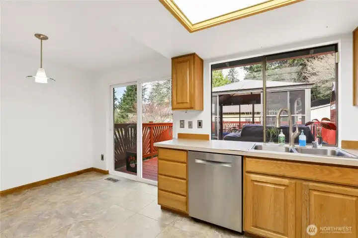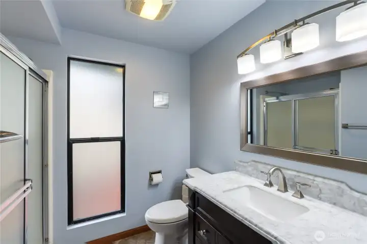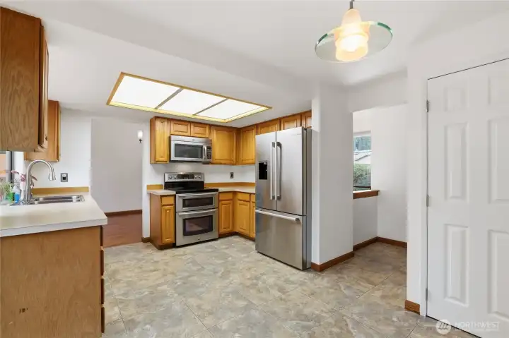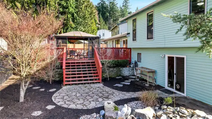 Pride of ownership defines this meticulously maintained residence situated on a spacious corner lot. With classic charm, the open and airy interior welcomes you with vaulted ceilings, tall windows, and gorgeous real hardwoods. The main level offers an effortless flow between the kitchen, dining, and living room, which is anchored by a stunning floor-to-ceiling brick wood-burning fireplace—the ideal centerpiece for gatherings and cozy evenings. Retreat to the upper level to find a primary suite with a private 3/4 ensuite, along with three additional comfortable bedrooms and a generously sized, newly remodeled full bathroom. For those seeking extra flexibility, the lower-level family room features a free-standing wood stove and presents lifestyle options for a perfect media room, home gym, or home office. The exterior is a true sanctuary designed for year-round enjoyment. A fully fenced backyard features paver patios, tranquil water feature, dedicated space for RV or Boat parking and an entertainment-sized deck with 4-season cabana. Lastly, a spacious 2-car garage, and notable recent improvements include the 50-year roof, new heat pump, new hot water heater and even freshly painted!. Centrally located just moments from the ferry, Navy bases, schools, parks, shopping and popular eateries. Pre inspected, turn key and ready for lucky new owners!