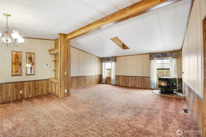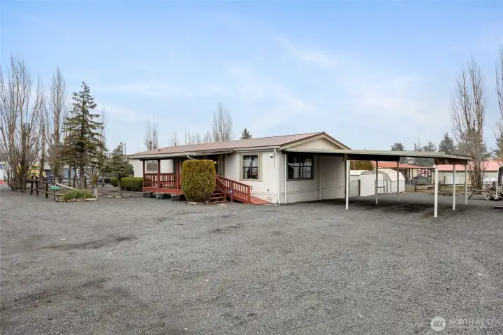 Situated on a large corner lot, this 3-bedroom, 2-bath home offers 1,512 square feet of comfortable and functional living space. Exterior features include a two-car covered carport, an additional separate vehicle cover located in the corner of the property, and dedicated RV/boat parking with a septic cleanout. The low-maintenance landscaping is complemented by mature trees, established shrubs, and a split-wood fence that enhances privacy. Enjoy the covered front porch, perfect for relaxing outdoors. Two metal storage sheds provide ample space for landscaping equipment and seasonal storage. The home also features durable metal roofing with seamless gutters and an oversized gravel lot offering abundant additional parking. Inside, you’ll find vaulted ceilings in the living and dining areas, creating an open feel. A pellet stove serves as a cozy focal point in the living room, along with built-in shelving throughout the home for added storage and character. A skylight in the living area brings in natural light. The kitchen features a large island, ample cabinetry for storage, and all appliances are included. A separate laundry area with included washer and dryer. The primary bedroom offers a large closet, soaking tub, and separate shower. This property combines space, functionality, and practical features both inside and out.