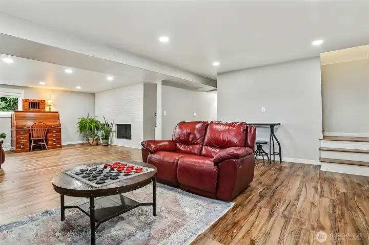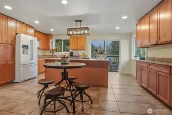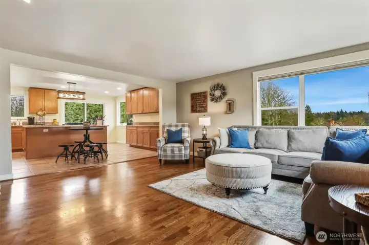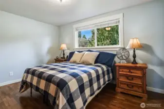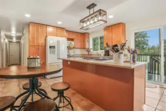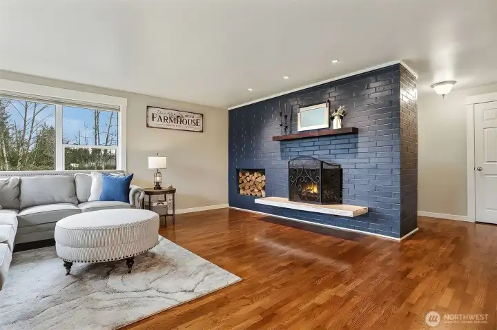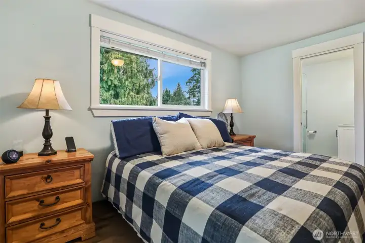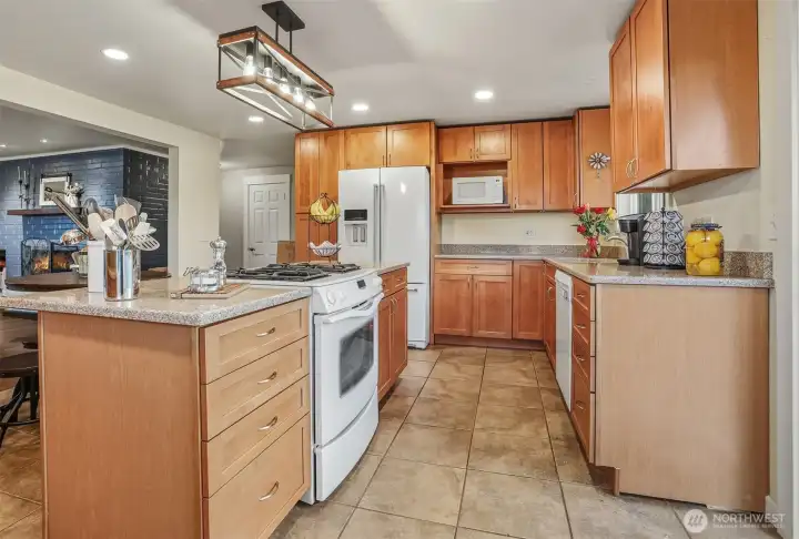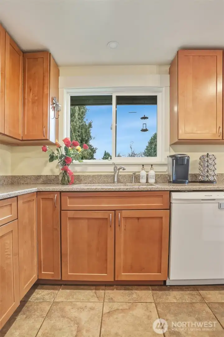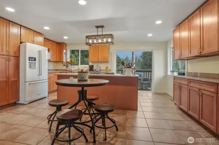 Beautiful Lea Hill home on private drive set on shy ¾-acre lot. Chef’s kitchen features granite counters, island cooktop, breakfast bar, recessed lighting, and white appliances. Sliders open to deck overlooking lush yard. Open living/dining areas offer hardwood floors, wood-burning fireplace, and large sunny corner windows. Upper-level primary includes private ¾ bath; hall bath has soaking tub. Daylight lower level with rec room, second fireplace, French doors to yard, plus laundry and ¾ bath. Detached double garage with 9’ doors and shop space, garden areas, and chicken coop. Excellent location near parks, schools & shopping.