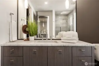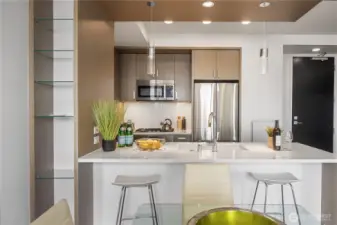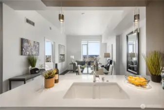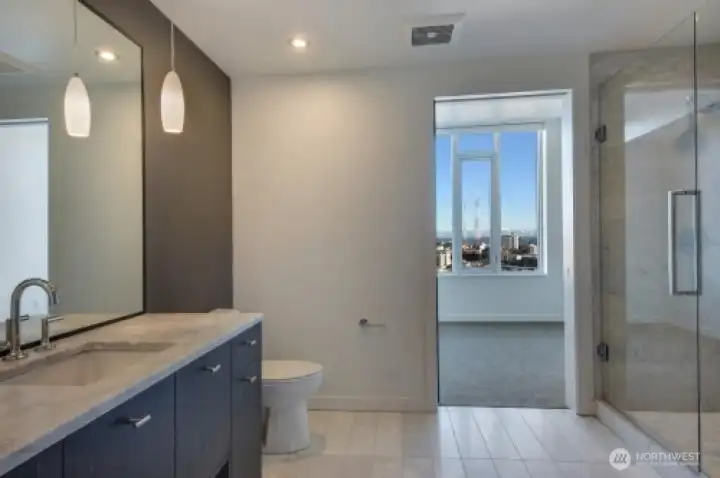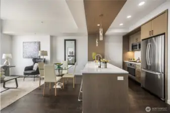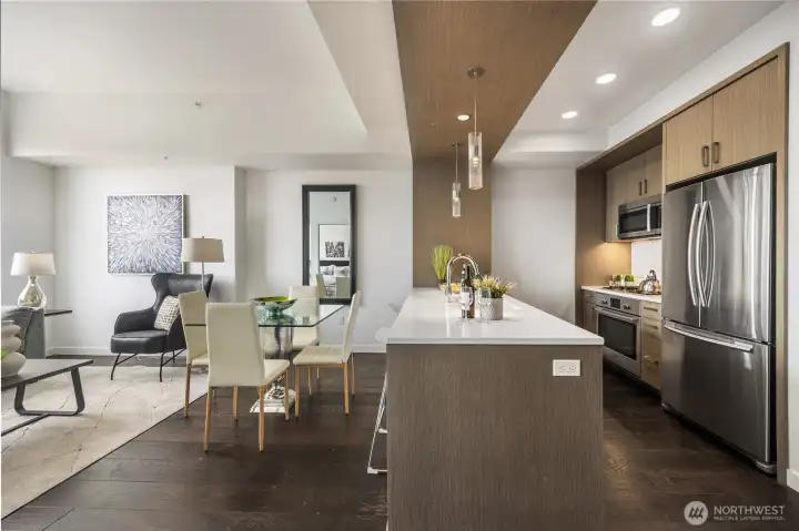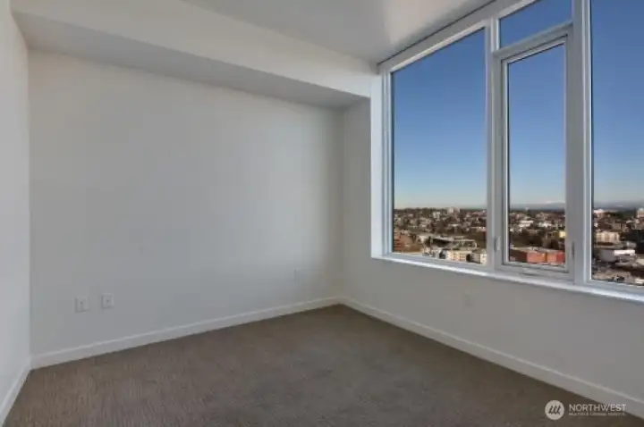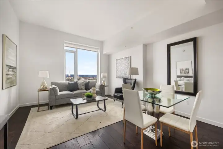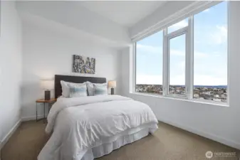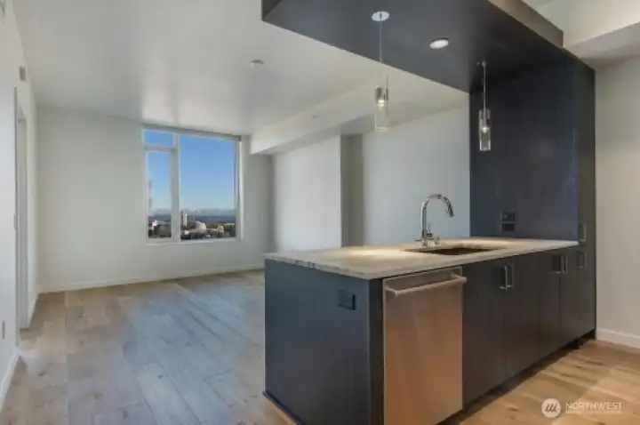 Luxurious living at its finest. This 22nd-floor residence offers approximately 696 sq ft of living space with a thoughtful open layout, high ceilings, and expansive city, mountain and lake views from large windows in each room. The interior features upscale finishes, including a modern kitchen with stainless steel appliances, gas cooktop, quartz countertops, soft-close cabinetry and center island with seating. The bedroom is generously sized with blackout roller shades. Engineered hardwoods throughout living area with carpet in the bedroom and tile in the bathroom. Home is completed with Marble stone shower, full walk-in closet with custom design, A/c, 1 parking space and storage in the underground garage. Luma's luxury amenities include 24-hour concierge, rooftop terrace, Club Room, Hot-tub, Library, meeting rooms, dog run and a fitness area. The buildings prime location is within steps to dozens of restaurants, shops, cafes, grocery, transit, parks and more. Easy commute to Downtown, South Lake Union, I-5, I-405, Capitol Hill and much more.