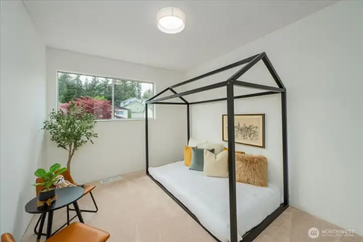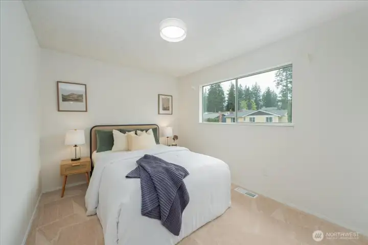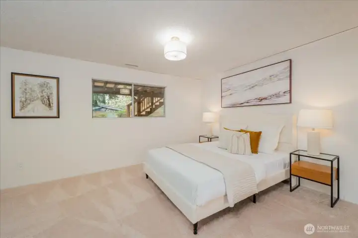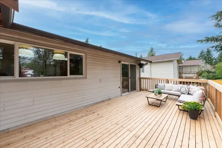 Welcome to Admiralty Woods! This charming home offers a light-filled living room with brick fireplace and pellet stove. The updated kitchen features quartz counters, tile backsplash, stainless appliances, and ceramic floors. Dining room opens to a cedar deck overlooking lush, wooded grounds. Four bedrooms on one level, including a primary suite with double closets and private bath. Updated hall bath with tile accents. Lower level includes a spacious family room with second fireplace, flex space, and unfinished bath/laundry. Two-car garage with shop space. Beautiful mix of lawn and trees in a prime Lynnwood location near shopping, transit, and Edmonds schools.