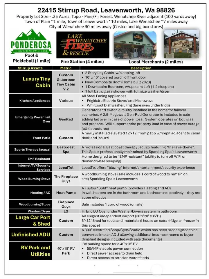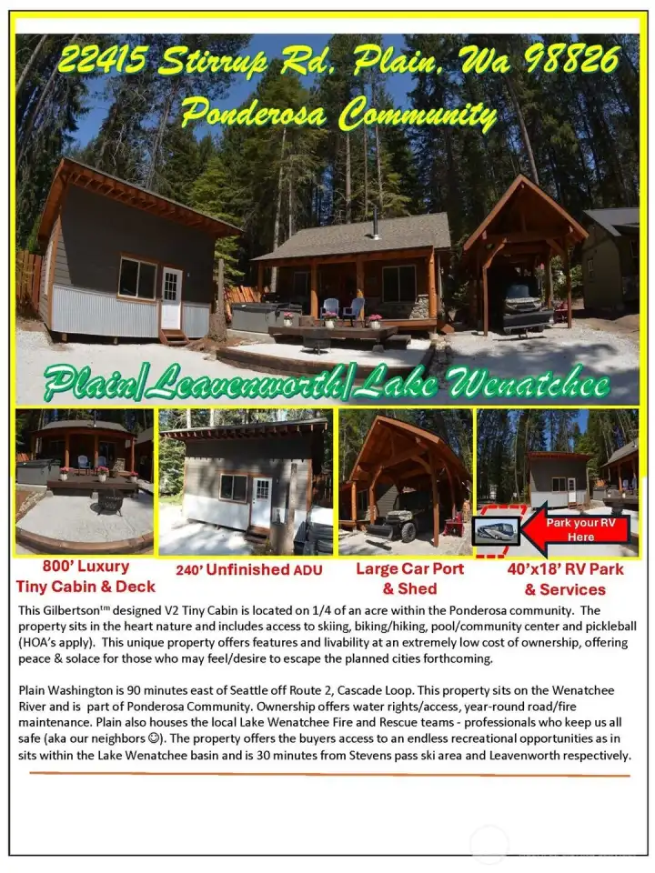 Elegant. log accented, 520 sf cabin w/loft, live edge window and door dressing, blue pine interior, on ¼ acre in the Ponderosa community of Plain, Washington. Built in 2023, this get-a-way has a number of features listed in the 2 page flyer found among the photos. This is a ready to use retreat complete with deck and fire-pit, granite countertops, sports jacuzzi, and rough wired and plumbed 300 sf detached building ready for you to finish into an ADU, or shop, or studio, or gym. Within just 30 minutes of Stevens Pass, Leavenworth, or Lake Wenatchee. Make your appointment now to view this woodland masterpiece.