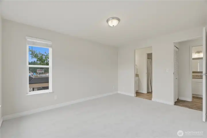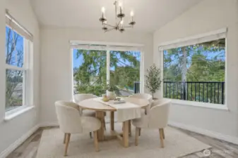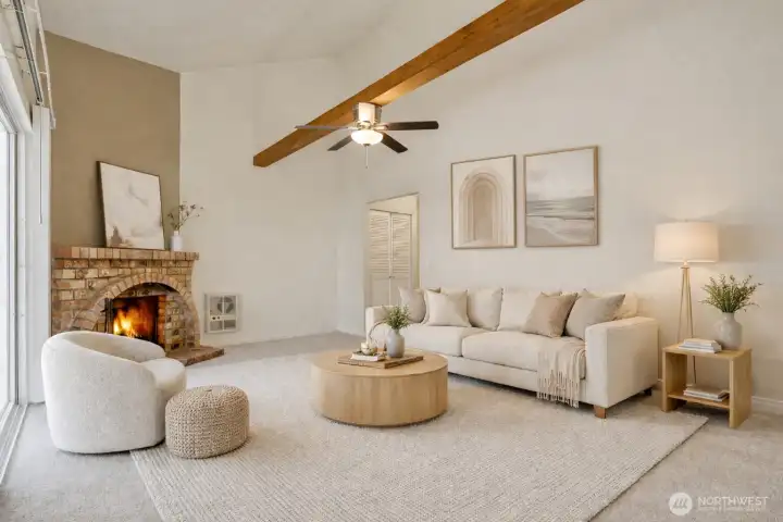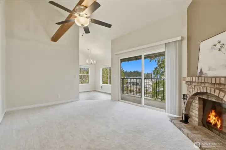 Top-floor end unit with soaring vaulted ceilings and an open, airy layout. Welcoming entry leads to a spacious living room featuring a cozy fireplace and access to a private covered balcony. Kitchen and dining area are filled with natural light from multiple windows, creating a bright and inviting space. Two generously sized bedrooms, with the primary offering direct access to the full bath plus an additional vanity area for added convenience. Large laundry room includes side-by-side washer and dryer and extra storage cabinets. Abundant storage throughout, including deck closet, linen closet, and coat closet. Brand-new carpet. No rental cap. One covered parking space included. Ideally located near Kingsgate amenities, The Village at Totem Lake, Woodinville wineries, parks, and quick freeway access.