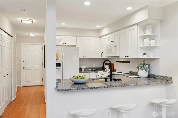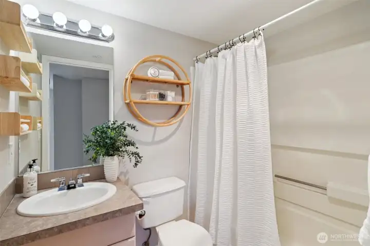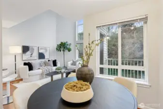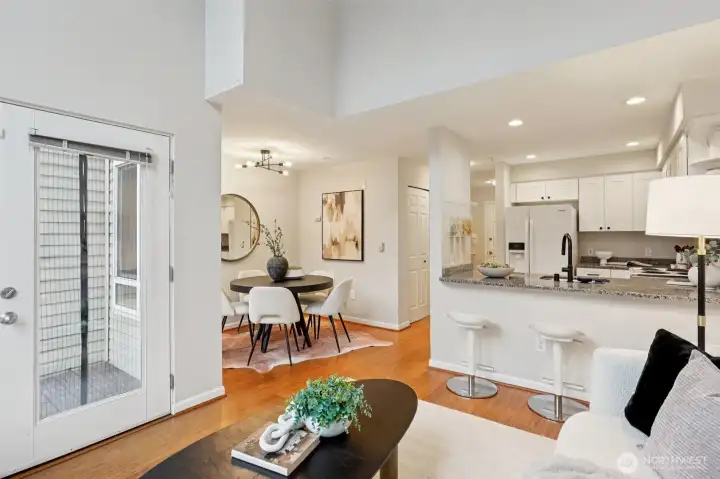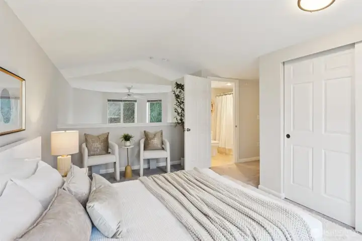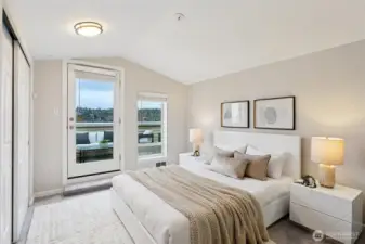 Water views in the heart of Interbay! Enjoy sweeping views of the Puget Sound and Olympic Mountains from this top-floor home with a quiet rooftop deck – set above the city and well suited for relaxing, entertaining, or enjoying sunsets – plus an additional deck off the dining area for seamless indoor-outdoor living. Light-filled interiors feature a dramatic two-story vaulted ceiling with triple east-facing windows, bamboo flooring, and a convenient powder room for guests. The updated U-shaped kitchen offers white cabinetry, granite counters, a brand-new dishwasher, and opens seamlessly to the dining area. A flexible loft bedroom with ceiling fan and full bath provides privacy and versatility, while brand-new custom closet systems throughout maximize storage. Additional highlights include stacked ventless washer/dryer, fresh interior paint, and updated lighting and hardware. Secure elevator building with secure parking garage and ample storage unit directly across the hall. Convenient location near Whole Foods, shops, and breweries, directly across from Interbay Golf Center, and minutes from downtown Seattle, Ballard, and Queen Anne. A rare opportunity combining views, quiet outdoor space, updates, and location convenience. A must see!