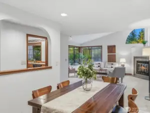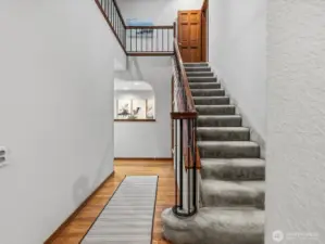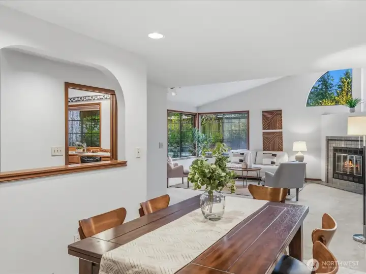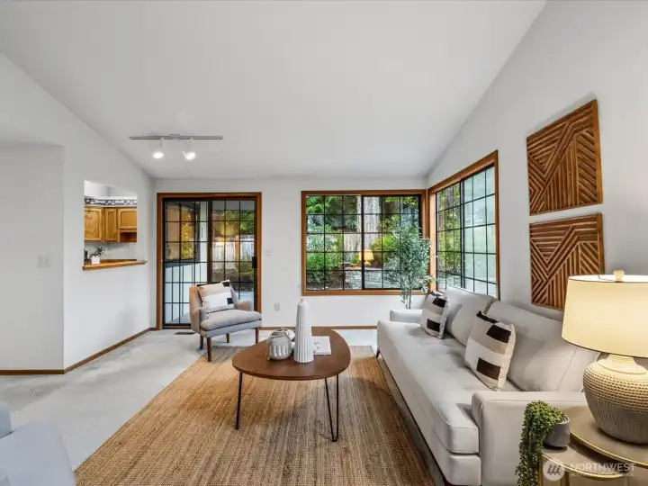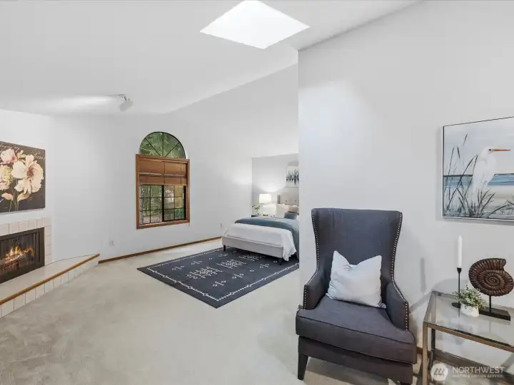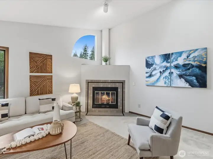 Rare Trillium Court gem with a unique floor plan featuring dual primary suites — one on each level — plus a den/office, full bath, and laundry on the main floor. At 2,295 sq ft, this 2-story townhome offers soaring vaulted ceilings, signature arched windows framing PNW treetops, hardwood floors on the main level, and two fireplaces — wood-burning in the living room and gas in the expansive upper primary suite. The upper suite also features a large walk-in closet, double vanity, soaking tub, and separate shower. A gated arched entry leads to arguably the finest outdoor space in the complex: a fully fenced, exceptionally private backyard enveloped by towering mature PNW trees and lush foliage, backing directly to a trail system — a rare sense of seclusion virtually unheard of in a condominium setting. Brick paver patio, covered deck, and 2-car garage. The seller is offering a $15,000 flooring allowance, allowing the next owner to personalize entirely to their taste. Near Mill Creek Country Club, Mill Creek Town Center, dining, shopping, and community trails throughout.