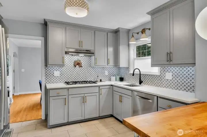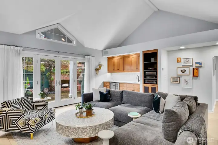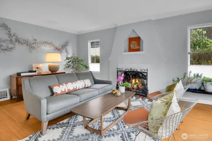 Ideally located just steps from 135-acre Lincoln Park and the beach, this 1931 Tudor blends enduring character with thoughtful, impeccably curated updates. Leaded windows, a bay window and fireplace anchor the formal living room. Beyond, a bright formal dining room captures views of passing ferries on Puget Sound. A custom family room unfolds with vaulted ceilings, heated tile floors and a thoughtfully designed bar with sink and refreshed counters. French doors open seamlessly to a private patio courtyard, creating an easy indoor-outdoor connection. The kitchen has been carefully updated for both everyday living and gathering, with custom-painted cabinetry complemented by new countertops, tile flooring and backsplash, high-end lighting and updated fixtures.Upstairs, a fully reimagined primary suite features rebuilt stairs, new flooring, a custom closet system, venting picture window to admire the Sound views, sitting room or office, and a tastefully appointed bath with custom cabinetry, tile and a spacious walk-in shower. Secondary bedrooms and the guest bath have also been refreshed. Outdoors, professionally redesigned landscaping surrounds inviting entertaining spaces, including a garden sanctuary with brick fireplace and Viking grill. Additional amenities include a wine cellar, sauna, workout area, ample storage throughout the home and parking for three cars. A rare combination of classic Tudor architecture and modern livability in an exceptional West Seattle location.