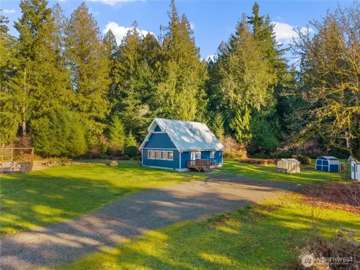 Discover your agrarian refuge on 2.5 sun-drenched acres near Hammersley Inlet. This thoughtfully crafted cabin honors simplicity and self-sufficiency. Original hardwoods, a clawfoot tub, and vaulted ceilings lend timeless character, while propane warmth and a rain-drumming metal roof ground you in the rhythms of the Pacific Northwest. Abundant windows frame an ever-changing forest canopy that shifts with every season. Step outside and the land opens up around you. An electrified workshop, greenhouse, fenced raised-bed gardens, and established fruit trees invite serious cultivation. A tranquil pond holds the sky in reflection. Fiber internet keeps you tethered to the world on your own terms, nothing more, nothing less. Shelton’s conveniences are minutes away, and Hammersley Inlet even closer. Those mornings when the water calls, a saltwater boat launch waits just two minutes down the road. Where morning mist settles over fertile earth and birdsong fills the canopy above, this is homesteading elevated, on land that is ready to meet your vision.