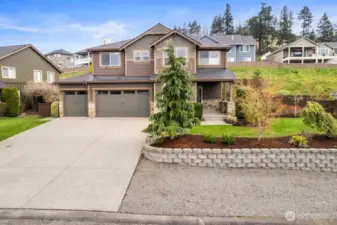 Welcome to this beautiful 4-bedroom two-story in the highly desirable Sumner View Estates. Situated on a large, level, fully fenced lot with territorial views and stunning sunrise and sunset skies, this home offers comfort, quality, and exceptional indoor/outdoor living. The main level features a private office, versatile flex room, and spacious great room with ample natural lighting from multiple windows. The gourmet kitchen boasts a Wolf range with upgraded hood, double ovens, walk-in pantry, huge center island with bar and abundant space for gathering. Upstairs offers three oversized secondary bedrooms, a generous primary suite with sitting area, walk-in closet, and 5PC bath, plus a large bonus room. Outdoor living shines with two patios, a covered and lit deck with skylight and fireplace, gas BBQ hookup, TV connections, front and back sprinkler systems, drip irrigation and French drains. The garden is truly special—featuring fruit trees, berries, raised beds, herbs, native plantings, and an incredible variety of flowering trees and shrubs designed to attract birds and pollinators. There is even a 3-car garage with extra-long third bay. Thoughtful upgrades throughout include new engineered hardwood floors (2021), upgraded carpet and pad upstairs, new roof (2021) with 50-year shingles and 20-year transferable warranty, new exterior paint (2021), fresh interior paint, new attic and crawl space insulation, A/C, and new smoke/CO detectors & more!