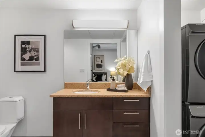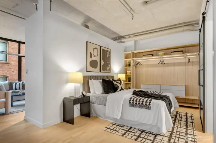 Refined Living at Mosler Lofts: Quietly positioned within one of downtown Seattle’s most respected architectural residences, this one-bedroom home pairs high ceilings with refinished wood floors and an efficient layout designed for easy daily living. A filtered SoHo brick outlook brings in natural light while preserving privacy. Stainless appliances, built-in water filtration, and a surface-mounted sliding door add clean modern function while a custom California Closet, sleek blinds, and retractable screen door enhance livability. A dedicated desk area opens to a rare approx. 250 square foot private patio with power, water, drip irrigation, 14 feet of Corten steel planters, a Tory Gate trellis, and established plantings including Karl Foerster grasses. Car (+ adjacent motorcycle) parking offers Level 2 EV charging and a 120-volt outlet. A dedicated storage unit for off-season items and outdoor toys. Concrete and steel construction, professional staff, fitness center, library, conference room, guest suite, and a rooftop garden with fire pit, barbecues, and active garden club reflect a welcoming, community-oriented building. Ideal as a primary residence or refined pied-à-terre. Come see it!