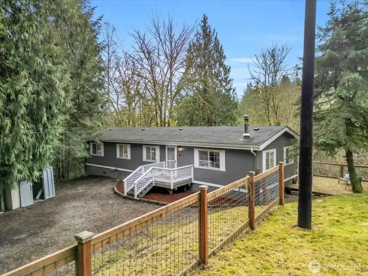 Welcome home to this beautifully updated 3 bed-2 bath home offering comfortable one level living in a peaceful park-like setting. Surrounded by mature greenery and open space, this property provides the perfect blend of privacy and convenience. Step inside to discover fresh interior paint and brand new carpet, creating a clean, move in ready feel throughout. The spacious living area flows together with a warm and cozy feel complete with a wood burning stove. The primary suite features a generous walk in closet and private en-suite bath, creating a comfortable retreat at the end of the day. Outdoor living truly shines here. Enjoy relaxing or entertaining on the huge back deck, fully fenced yard, complete with garden space and fire pit. A detached shop/garage add incredible versatility for storage, projects or parking. Don't miss this opportunity to enjoy peaceful living with practical amenities.
