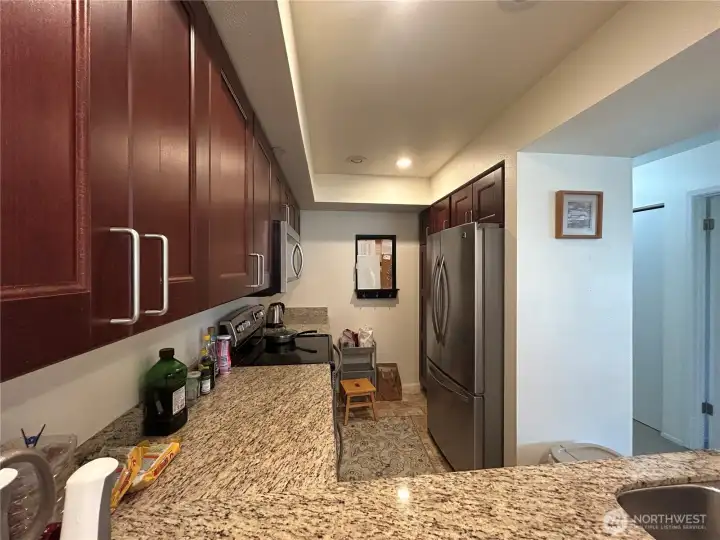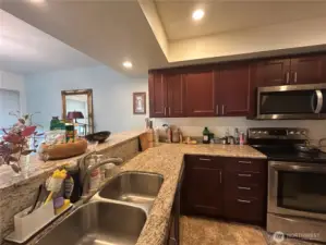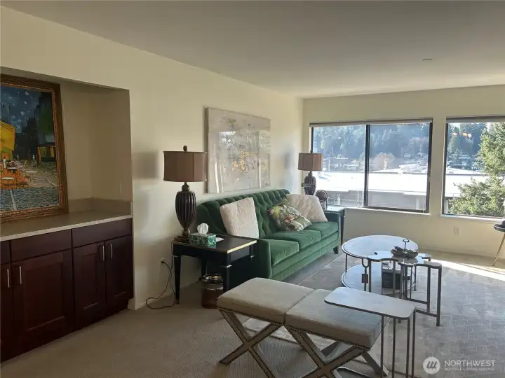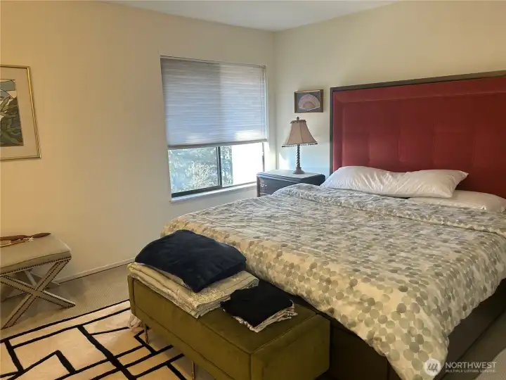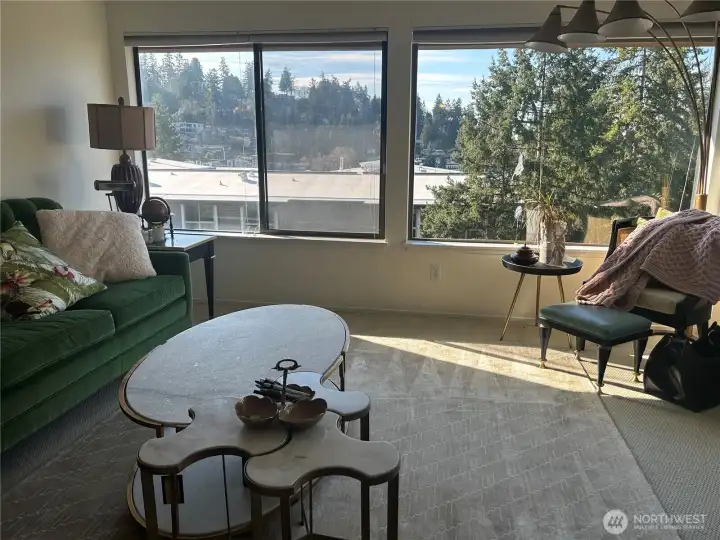 UNBELIEVABLE VALUE! The unit directly below sold for $900K last year! This beautifully updated northwest corner condo offers peaceful nature views overlooking Wildwood Park and captures the very best of Downtown and Old Bellevue living. This spacious top-floor 2-bedroom, 2-bath home features an open layout filled with abundant natural light, ideal for both everyday living and entertaining. Large picture windows and an oversized private balcony provide tranquil park views with a peekaboo glimpse of Meydenbauer Bay. Relax outdoors, or unwind inside by the cozy gas fireplace. The stylish kitchen showcases granite countertops, stainless steel appliances, and an eating bar. Recently replaced a brand-new water heater. Both bedrooms feature custom closet systems and have a partial lake view. The home also offers exceptional storage, featuring multiple closets, a spacious laundry room equipped with a full-size washer and dryer, and an additional locked storage unit. Secure underground parking includes two deeded parking spaces. Just steps from shops, restaurants, cafés, and parks, including Bellevue Downtown Park & Meydenbauer Bay Park, this home combines serene natural surroundings with unbeatable urban convenience.