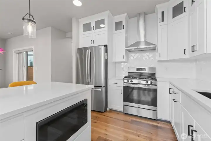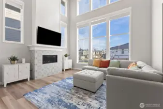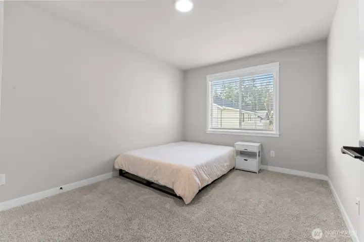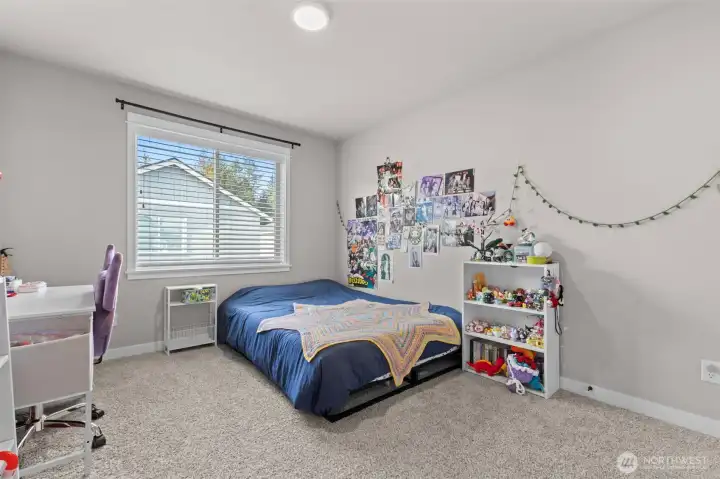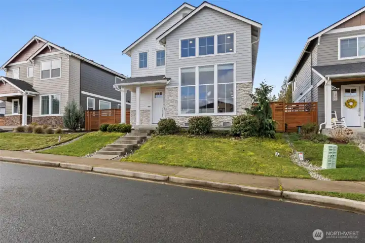 Welcome to this stunning 3-bedroom, 2.5-bath home in Bonney Lake, built in 2022, offering 2,148 sq ft of thoughtfully designed living space with AC for year-round comfort. The open-concept layout boasts vaulted ceilings, bright windows, and a kitchen featuring quartz countertops, stainless steel appliances, a large walk-in pantry, and a breakfast bar—perfect for everyday living and entertaining. Upstairs, the primary suite includes a 5-piece en suite bath with separated double vanity, soaking tub, walk-in shower with tile finishes, and a large closet. The additional bedrooms are generously sized, with a cozy reading nook and convenient upstairs utility room. Step outside to a low-maintenance turf yard with a covered patio, gas hookup for your BBQ, and TV mount for effortless outdoor entertainment. The epoxy-finished garage offers additional storage space. Set up a showing today!