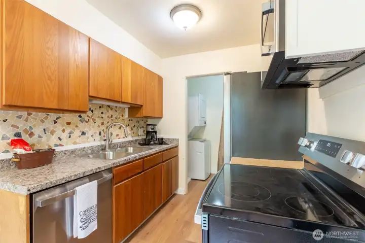 Mid-Century Character Meets Modern Luxury in the Heart of University Village. Experience the perfect blend of 1940s "Old Seattle" architecture & sophisticated modern updates. Tucked away behind mature native landscaping, this stunning 1st-floor home offers a serene, garden-like escape. From the moment you enter through your private exterior entrance, the quality of this top-to-bottom renovation is clear—it is exceptionally clean, comfortable & completely turnkey. Every inch of this home has been meticulously reimagined. Modern luxury meets durability with brand-new LVP flooring & crisp baseboards throughout, complemented by a fresh, contemporary interior paint palette. The chef-inspired kitchen is a standout, featuring a full suite of brand-new stainless steel appliances—including an electric range, microwave, dishwasher & refrigerator—alongside a new sink, disposal & updated GFCIs (in kit & bath). The spa-like bathroom boasts a classic subway tile surround, new vanity & high-end fixtures. Thoughtful upgrades continue throughout the home with new cordless window blinds, updated ceiling lighting (pre-wired for fans) & the ultimate urban luxury: a brand-new, in-unit washer & dryer. Situated in a prime location with a high walk score, you are just steps or a short transit ride from University Village, the UW Campus, Seattle Children’s Hospital & an array of world-class dining. Experience the character of the past with the peace of mind of a brand-new home. No rental cap.