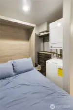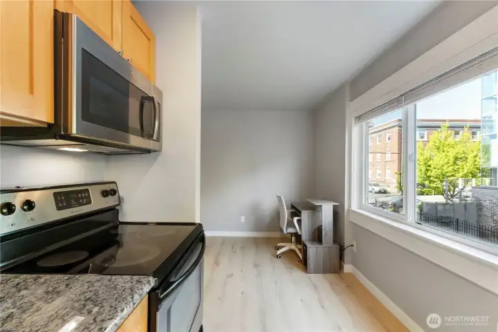 Modern efficiency meets unbeatable location in this updated studio at the Vertigo condominium in Capitol Hill. Come home to a thoughtfully designed space, where this light-filled unit features hardwood and ceramic tile flooring, insulated windows, and a smart open layout that maximizes every inch. The full kitchen offers eating space and stainless appliances, including range, microwave, dishwasher, refrigerator, plus in-unit washer and dryer for everyday convenience. Enjoy secure lobby entry, elevator access, rooftop deck with territorial views, fitness room, basement storage (#32), and high-speed internet availability. HOA dues include water, sewer, garbage, and common area maintenance. No rental cap makes this a compelling investment opportunity. Unbeatable walkability in the heart of Capitol Hill—just one block from Broadway and steps to the neighborhood’s best dining, nightlife, shopping, and culture. Enjoy effortless access to the Capitol Hill light rail station, local cafes, gyms, grocery stores, and the public library. Spend weekends at nearby parks, including Volunteer Park, or explore the vibrant energy right outside your door. This is quintessential Capitol Hill living with everything you need just moments away.