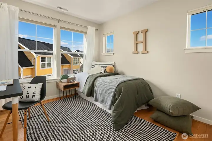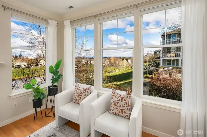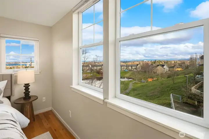 Welcome home to this special house in the heart of West Seattle. This wonderful abode is perfectly situated in the desirable High Point neighborhood where it boasts a prime perch above the reservoir with a sweeping territorial, Sound and mountain view. Enjoy a welcoming front porch where you can relax while gazing out at a verdant green space. Upon entry, the home invites you in warmly with an open living area and kitchen. Entertaining is easy here. Other main floor highlights include ample kitchen storage and an enviable pantry space. The upper level has 3 spacious bedrooms. The primary bedroom is cheery and light-filled with a well appointed en-suite bathroom. Don't miss the eastern views from there! There's a fourth bedroom on the lower level that serves beautifully as a spare bedroom. The additional room on the lower level flexes as an office, workout space or media area. Enjoy the rare 2 car garage with additional storage. Air-conditioning to boot! This spacious serene home is not to be missed. You'll appreciate the superb location just minutes to the West Seattle Junction, Lincoln Park, Alki Beach, countless shops and restaurants. This locale further offers a swift commute downtown by car, bike or express buses.