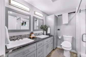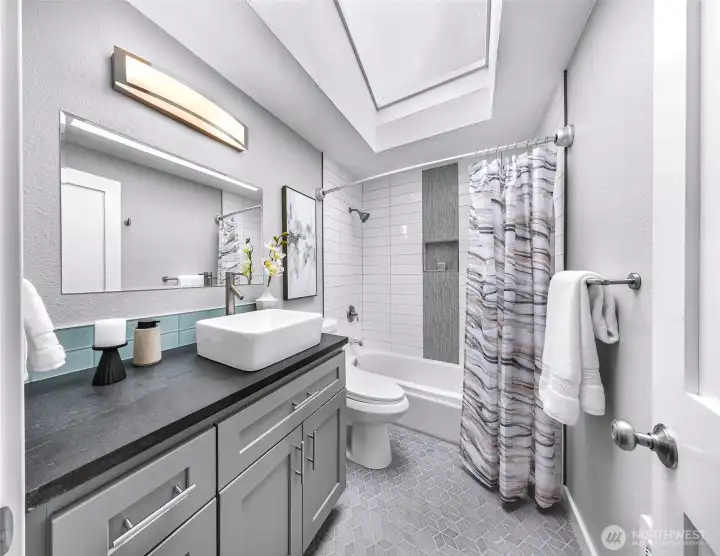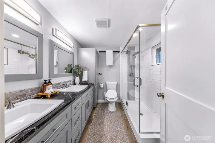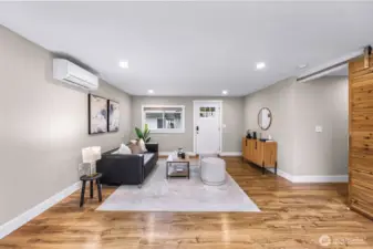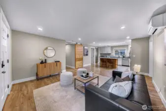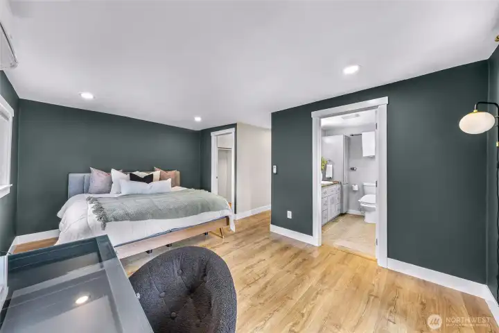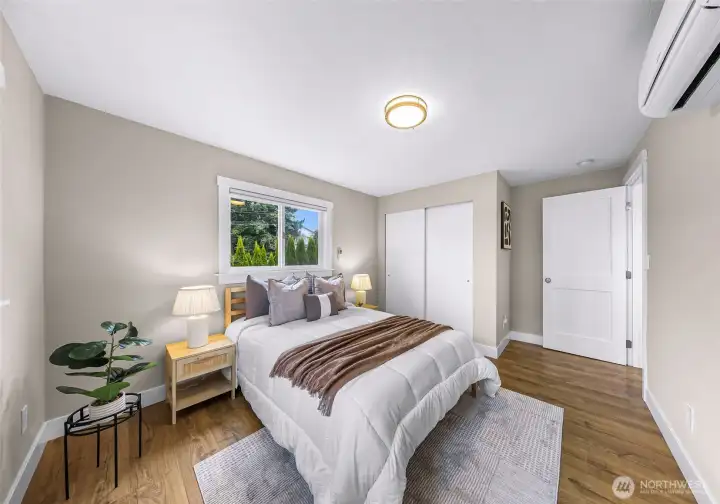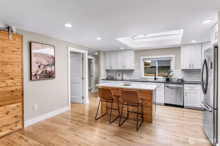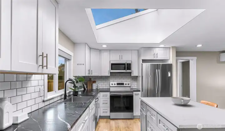 Tastefully renovated single-level home featuring a comprehensive update throughout. The redesigned kitchen offers modern cabinetry, stainless steel appliances, and durable stone surfaces. The primary suite includes a spacious walk-in wardrobe and a custom-appointed bathroom with radiant heated flooring, along with direct access to an outdoor deck. A separate detached studio provides flexible space ideal for a home office, creative workspace, or learning environment. Abundant natural light fills the home through expansive skylights. Year-round comfort is ensured with an efficient ductless heating and cooling system. The property also includes a generous rear yard with newer deck and an approximately 650-square-foot detached shop suitable for parking or workshop use. Conveniently situated close to schools, retail amenities, and Paine Field/Boeing. Welcome home!