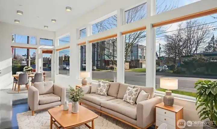 Exceptional opportunity to own a corner live/work townhome filled with amazing natural light throughout. The main living level features an open concept layout, ideal for modern living and effortless entertaining. The upper level includes two comfortable bedrooms, highlighted by a spacious primary suite with a spa inspired bathroom and oversized shower. On the ground floor—with its own separate entrance—a versatile 600 sq. ft. street level flex/studio space offers outstanding visibility and endless possibilities. Complete with its own kitchenette and full bathroom, this space is perfect for work, guests, or rental use. See MLS #2484782 for rental history. A secure parking garage provides convenience and peace of mind. The rooftop deck showcases stunning territorial and mountain views—including Rainier, the Cascades, and the Olympics—creating an ideal setting for relaxing or hosting gatherings. Located in a highly walkable neighborhood close to shops, restaurants, Met Market, and Downtown Ballard, this home delivers the perfect blend of flexibility, comfort, and vibrant urban living.