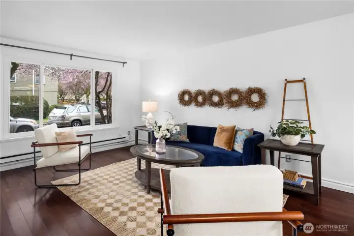 Investment opportunity for a solid unit in desirable Laurel Crest Condominiums! Townhome style, 2-level condominium with open floor plan, hardwood floors & large windows for abundant natural light. Kitchen has been remodeled w/granite counters, tile back splash, stainless appliances & designer lighting. Upstairs are 2 spacious bedrooms, an updated full bath & additional walk in closet. In unit washer/dryer on the main floor. Close to Children's Hospital & Met Market; take the Burke Gilman Trail to UW, University Village or Light Rail. Well maintained grounds and community garden P-patch; Complex has extra bike storage & affordable storage units. Solid HOA, pet friendly & no RENTAL CAP.