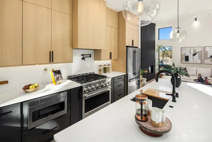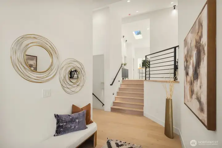 This beautiful high-end custom home is tucked away in a Bellevue cul-de-sac. Its high ceilings, large windows and strategically placed skylights allow plenty of sunlight to pour in. The open and spacious layout of the interior has 4 bedrooms, 4 1/2 bathrooms with heated flooring in the master bathroom, a spacious dining room area integrated with a modern kitchen, 4 state-of-the-art fireplaces, and a separate den that can be used as an office. The basement has its own bedroom, bathroom which could be a multi-generation living. Central A/C. Two-car garage with extra space for storage or workshop. Luxurious interior and exterior finishes throughout. Surrounded by beautiful greenery with a patio that provides privacy. Living here, you'll be minutes away from I-405, I-90 and downtown Bellevue