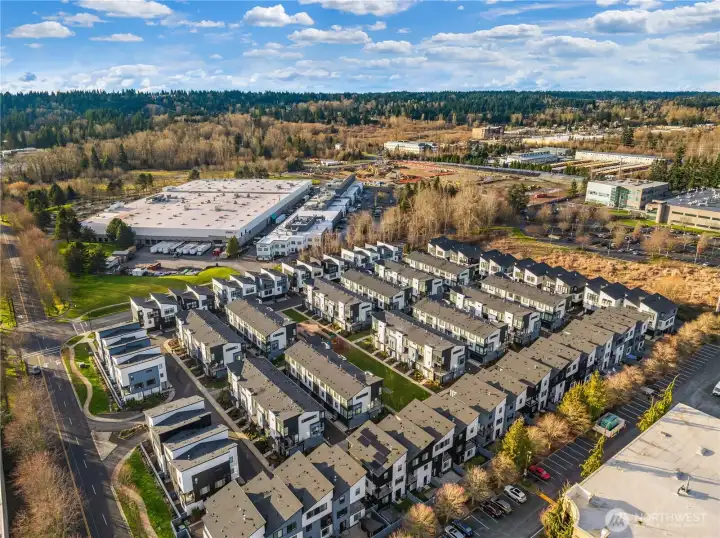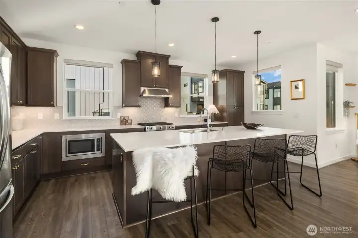 Tucked into the sought-after 220 Towns at Canyon Park, this end-unit townhome stands out for what buyers notice first- massive windows and incredible all-day natural light that fill the home from morning to evening. The tree-lined boulevard approach and proximity to the community’s expansive park create a welcoming, peaceful setting, while freeway access just minutes away keeps everything convenient. Built by Toll Brothers and thoughtfully upgraded throughout, the popular Inglewood Elite floor plan offers 4 bedrooms and 3.5 baths with soaring 9-foot ceilings and a bright, open-concept great room centered around the fireplace. The gourmet kitchen and dining area flow seamlessly to a covered balcony, ideal for everyday living and entertaining. The lower level features a private guest suite and access to the 2-car garage, while outside a fully fenced 'just big enough' yard provides the perfect space for a pup or gardening. Just steps from the large community park and located within the acclaimed Northshore School District, this home blends light, layout, location, and lifestyle in one of Bothell’s most desirable communities.