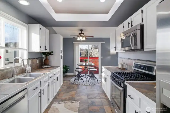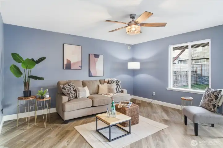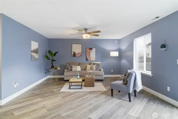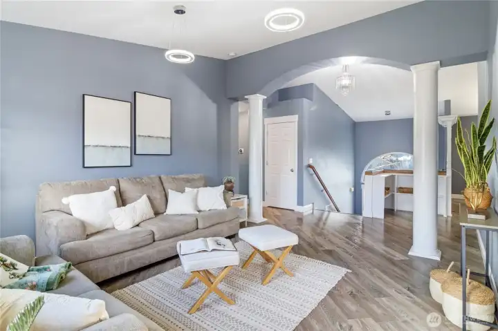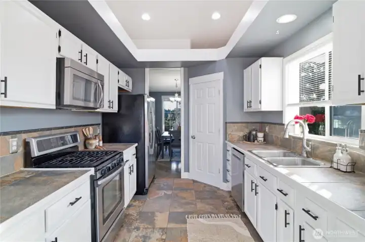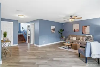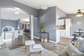 Five bedrooms, no HOA, and best of all- no I-5 commute to JBLM! Welcome to your spacious 2,600 sqft home, situated on a large cul-de-sac lot in prime location Yelm, offering a rare combination of size, flexibility, and freedom. A wide entry and open staircase lead into a bright living room with charming accent pillars, vaulted ceilings and elegant light fixtures, creating a welcoming first impression. The functional layout features two separate dining areas, an updated kitchen with stainless appliances, gas range, refreshed cabinetry, and a walk-in pantry. Ideal for everyday living and entertaining. Upstairs bathrooms have been updated with crisp white vanities and updated fixtures, including a fully-refreshed primary bath with modern dual-sink vanity. Fresh interior paint and modern lvp flooring throughout add a move-in-ready feel. The lower level offers a large open family room, two additional bedrooms, and another updated full bath- providing excellent separation for guests, home offices, or multi-generational living. Downstairs laundry room, with included newer washer and dryer, and garage has extensive storage shelving. Outside, enjoy a large fully fenced backyard with patio, play structure, dog run, fire pit and storage shed- plenty of room to relax, play, or garden. Located minutes from all Yelm amenities and schools, this home offers a lifestyle with more freedom and space, at an undeniable value. Don't miss it!