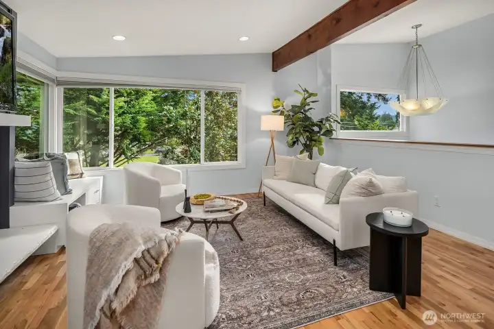 Immaculate turn-key ready home in the coveted Surrey Downs community. This 4 bedroom, 2.5 bath residence offers a seamless blend of comfort and convenience just blocks from downtown Bellevue. Soaring vaulted ceilings and rich hardwood floors enhance the light-filled living and dining spaces, creating an inviting setting for everyday living and entertaining alike. The chef’s kitchen features granite counters, stainless steel appliances, custom cabinetry, and thoughtful storage, flowing effortlessly to the main gathering areas. The spacious main-level primary suite serves as a private retreat and features an adjacent 3/4 bath with an oversized dual head shower and expansive vanity space, plus two walk-in closets and easy access to the backyard. The lower level offers two additional generous bedrooms, a cozy family room with fireplace, and flexible space ideal for guests, work, or play. Added highlights include central A/C, a new heat pump for year-round comfort, two fireplaces, a wine cellar, and an expansive 3-car garage. Step outside to a large patio ideal for entertaining, surrounded by mature landscaping that creates a private, peaceful setting. Located in award-winning Bellevue School District with easy access to downtown shops, dining, parks, and 405 and 520, this home delivers both lifestyle and location.