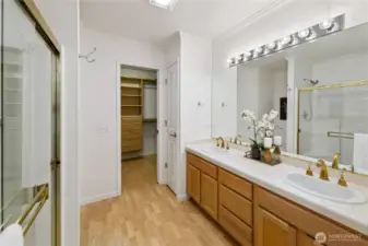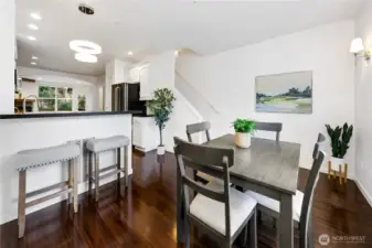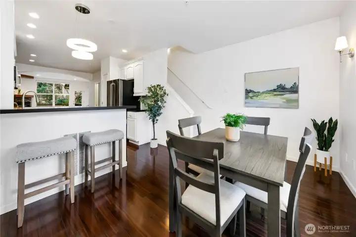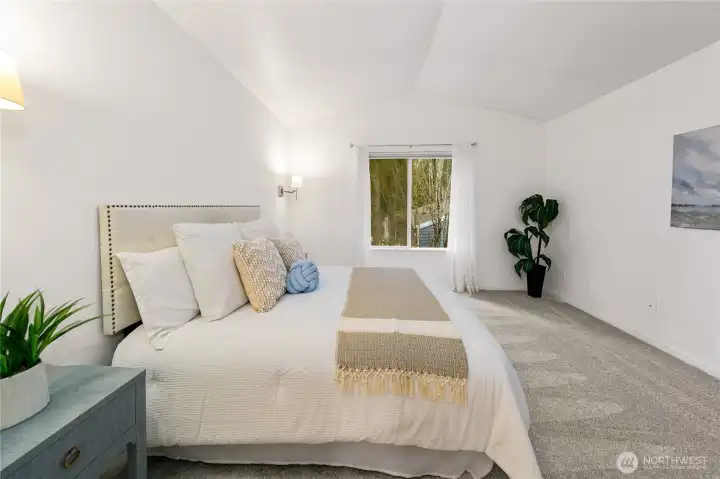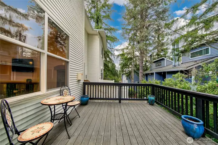 2 bedrooms plus bonus in prime location! Seamless main floor layout with great room style kitchen, living and dining flows together ending in entertainment size deck outside a glass framed door that lets in natural light. Easy care laminate floors, corner gas fireplace, and updated kitchen includes honed granite countertops, gleaming white cabinets with crown molding, full height glass tile backsplash and stainless steel appliances with bar/counter seating on both sides for your guests. The upper level features the spacious master suite with vaulted ceilings and attached 3/4 bath with tile counters, two sinks and walk in closet with custom California Closet system. Across the hall is the Jr. Primary also with vaulted ceilings, California closet system, storage loft and attached full bath. Two car tandem garage offers extra storage and an over 12' x 10' finished den/office with heat that is also rough plumbed for a bath and ready for your finishing touches! LOW HODs, NO assessments, roof replaced in 2024, minutes to downtown Bellevue, 405, 90, Factoria Square, shopping and all amenities for an easy commute!