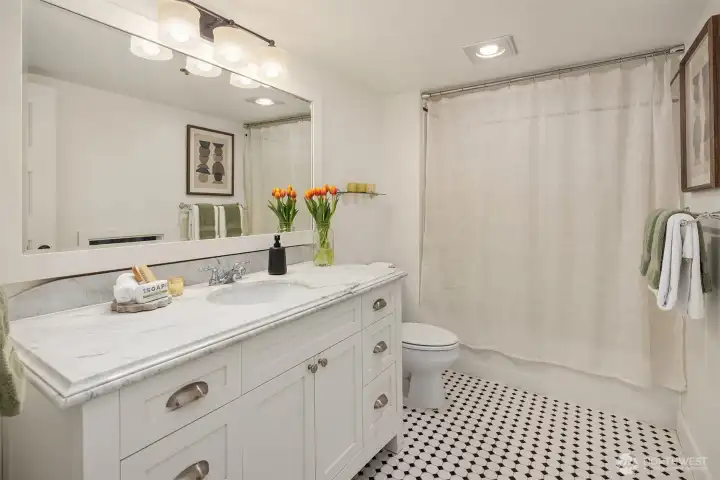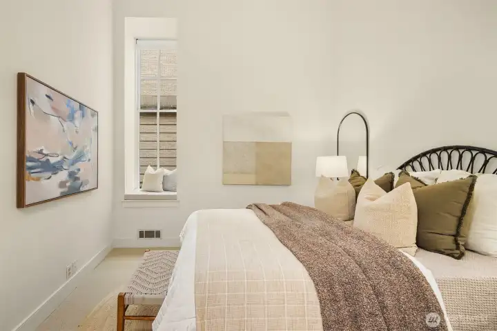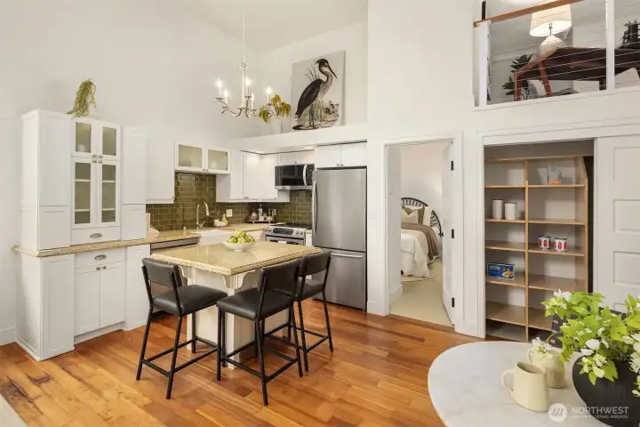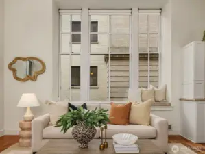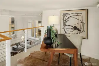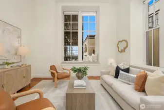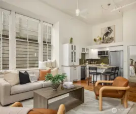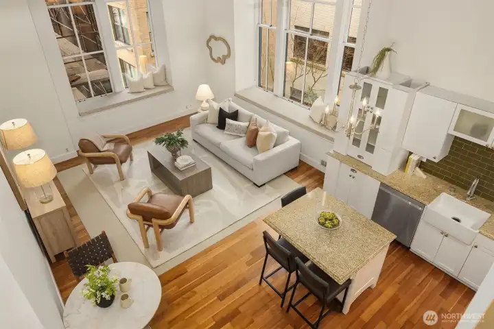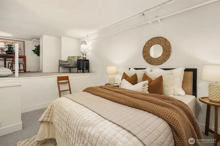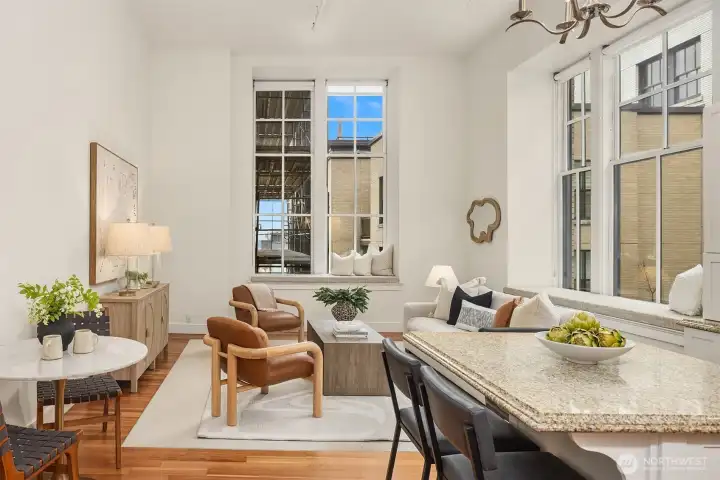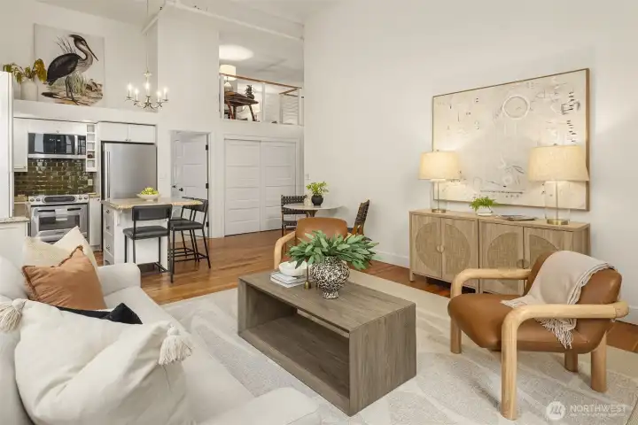 Perched at the top of Queen Anne Hill in the iconic Queen Anne High School, this 1,019 sq ft condo, blends historic grandeur with modern comfort. Enter directly from the impressive Galer street entrance without using the elevator (south elevator access also available) and step into a dramatic living space with soaring 13-foot ceilings and oversized windows, framing views of the Space Needle and Puget Sound. Luxurious 100% wool carpet and wood floors underfoot, the thoughtful floor plan includes two bedrooms, walk-in closet, one full bath, and a versatile loft—perfect for an office, media room, or reading space—overlooking the open living area. Laundry hookup available in-unit, with a free community laundry room just around the corner. Secure, large in-unit storage space is tucked quietly under the loft. Pet friendly and investor friendly with no rental cap, the unit was previously rented for $3,900/month. Two secure indoor parking spaces provide rare ease in this coveted neighborhood. Residents enjoy an expansive shared view deck with BBQs and seating, ideal for entertaining against a sweeping backdrop of city, water, and mountains. Perfect spot to watch the fireworks on NYE and 4th of July! Unbeatable location just moments from Queen Anne Avenue and Seattle Center—restaurants, coffee shops, groceries, gyms, concerts, and culture, all at your doorstep. Historic character, iconic views, and unmatched location—this is Queen Anne living at its finest.