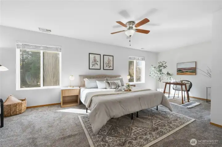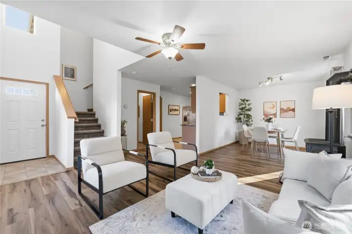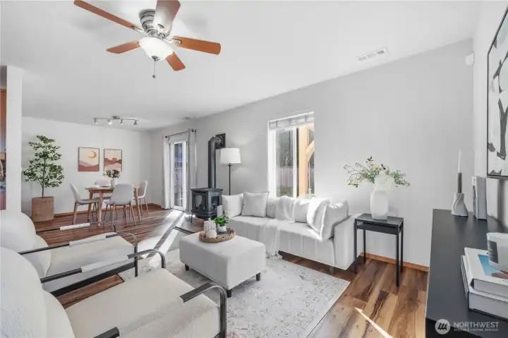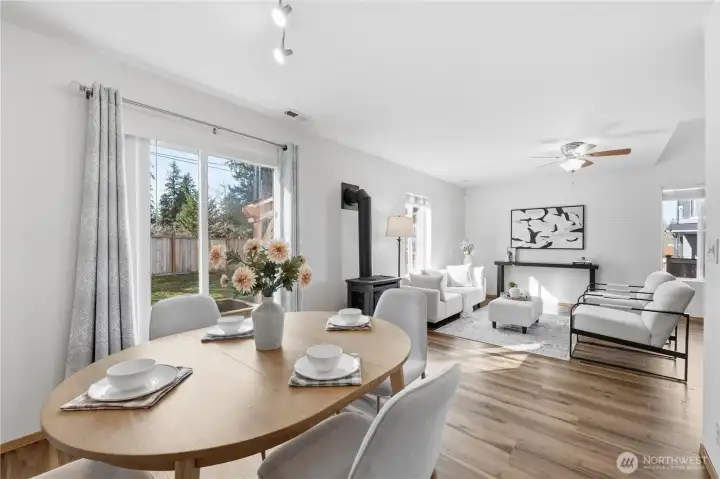 This beautifully maintained 3-bedroom, 2.5-bath home blends comfort, smart updates. Fresh laminate flooring flows throughout. A cozy gas stove located in the heart of the living room. Major upgrades are already done for you, including a new roof with transferable warranty and an HVAC air scrubber system for cleaner indoor air. Upstairs, the spacious primary suite offers a walk-in closet and attached on-suite bath. Convenience of upstairs laundry and the generous storage space. All appliances are included, making this truly move-in ready. Step outside to your oversized backyard, a rare find in this neighborhood, complete with a charming covered pergola perfect for entertaining, relaxing evenings, or weekend gatherings. Across the street is a large field and sport court for your enjoyment. Extra 3 car parking out front adds flexibility for guests or additional vehicles. Located moments from Lake Sawyer and direct access to the lake for recreation and play. Thoughtfully updated, move-in ready, and positioned in a sought-after community—this home is the lifestyle upgrade you’ve been waiting for. Current Mortgage is possibly assumable with a VA 2.25% interest rate.