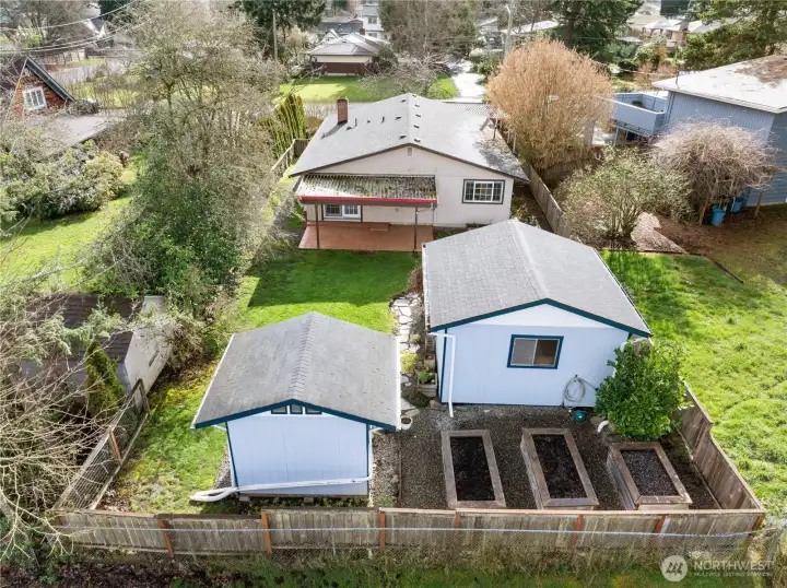 AMAZING one-level living in a lovely North Tacoma neighborhood! This well maintained 3-bedroom/1.5-bath home offers extra living areas and a light and bright kitchen with plenty of counter space. Vinyl windows, ductless heat pump, and a cozy fireplace for year-round comfort. Step outside to a beautifully maintained backyard retreat featuring established garden beds, lush landscaping, and plenty of room to relax or entertain under the covered back patio. The impressive 16x16 powered workshop with built-ins provides exceptional space for projects, storage, or hobbies, while the additional finished 8x8 studio is a perfect flex room or work from home office. With versatile outbuildings and a thoughtfully designed yard and fully fenced yard, the opportunities here are truly endless. All just moments from Proctor District amenities, dining, schools and parks. A special must see!