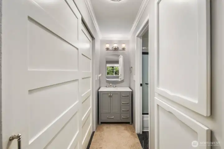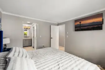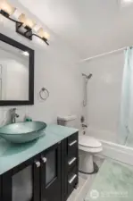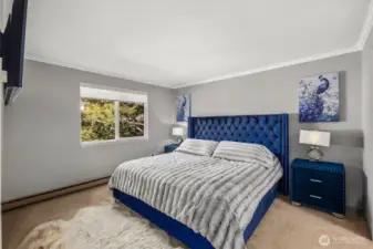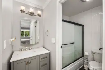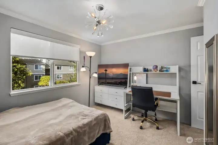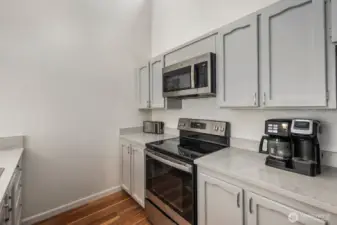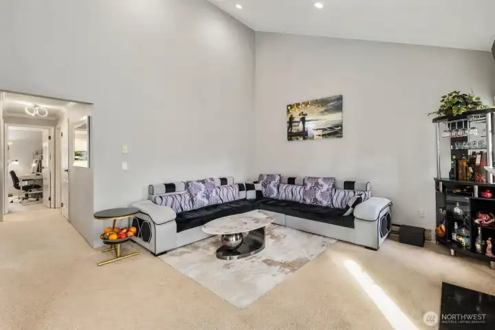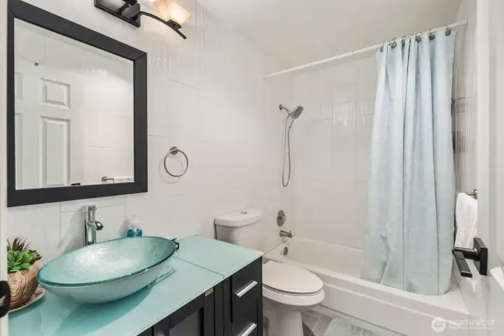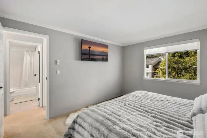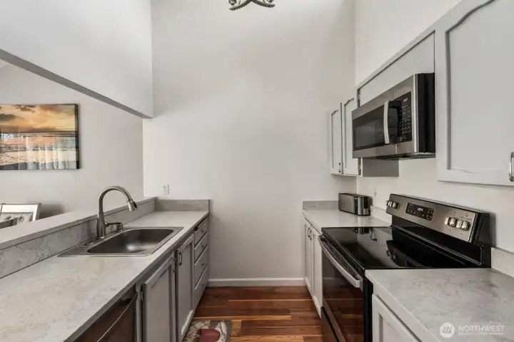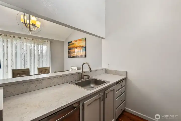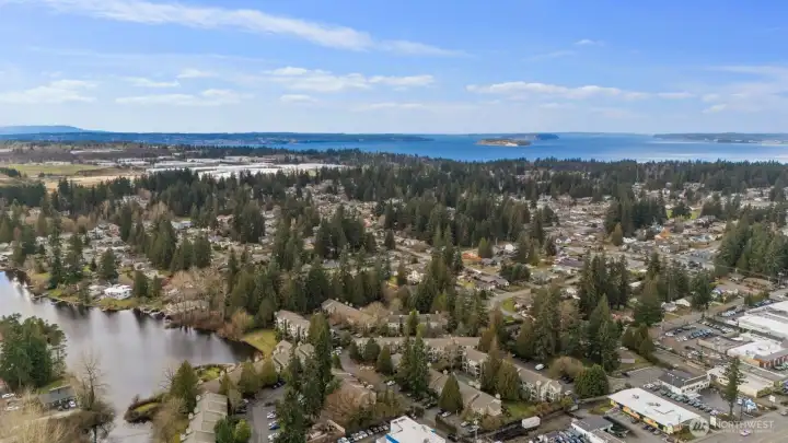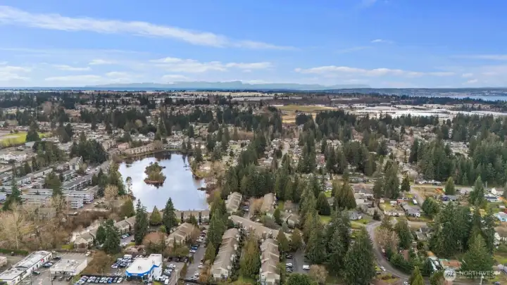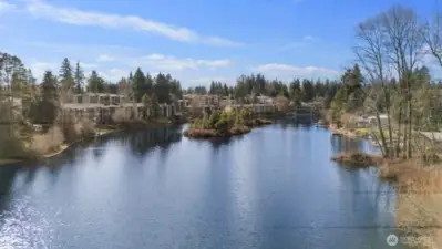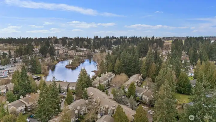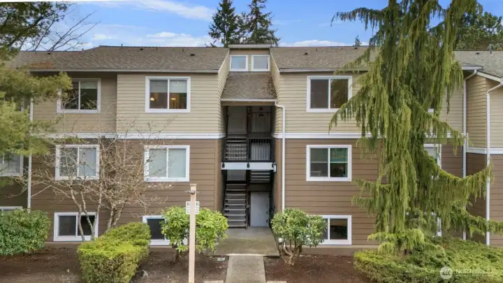 Light, bright and open, beautiful top floor unit, with vaulted ceilings in the Village by the Lake Condominiums. When you walk into this lovely condo, your first thought will be "WOW", the high ceilings, remodeled wood burning fireplace surround, the sleek quartz kitchen countertops, painted kitchen cabinets, modernized bathrooms, laminate flooring in the kitchen and dining room, scream pride in ownership. The primary bedroom features an ensuite bathroom, with a nice size second bedroom that is bright. This move in ready condo also has a patio as well as an in-unit washer and dryer. Village by the Lake Condominiums is a well maintained condo complex with newer roofs and siding with an outdoor pool, athletic courts, game room, ample guest parking and access to Beverly Lake. Conveniently located near restaurants, coffee shops, shopping, Boeing, Hwy 526, and I5.