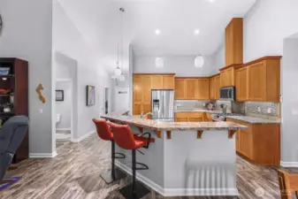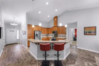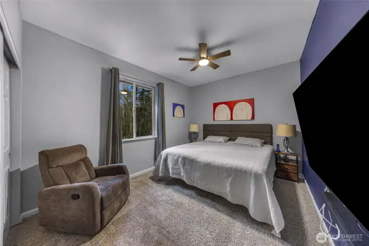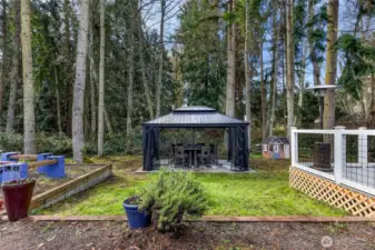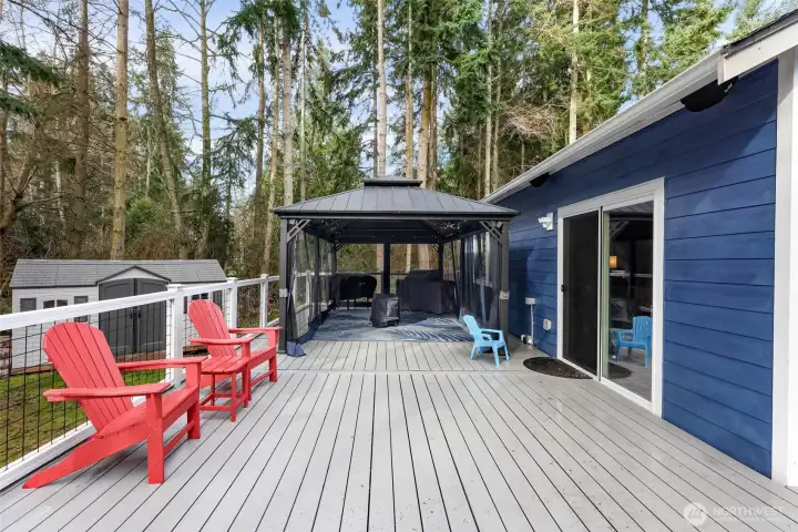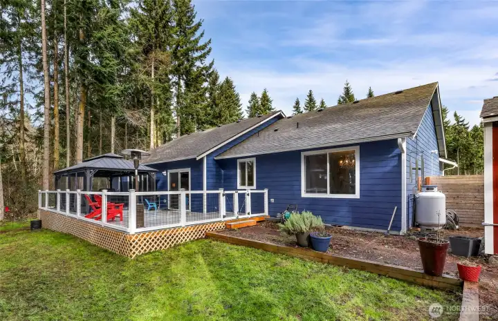 Tucked into the peaceful Fish Forest community near the heart of downtown Freeland, this spacious custom rambler offers privacy, flexibility & effortless entertaining. Set on a shy ½ acre backing to fir & hemlock, enjoy a tranquil setting just 2 mins to town amenities & Hwy 525. Outdoor living shines with an entertainment-sized deck & gazebo, plus a second backyard gazebo seating area perfect for relaxing or hosting. Covered RV parking fits a 45-ft RV or extra vehicles. Large garden/storage shed + detached insulated outbuilding w/power currently used as home office/gym offers endless possibilities. Inside, vaulted ceilings highlight the open-concept great room filled w/natural light. Kitchen features stainless appliances, custom tile backsplash & eating-bar island w/seating for four. Thoughtful layout provides separation & versatility. Primary suite sits privately at one end w/walk-in closet & ensuite bath. Opposite wing includes a bedroom + massive entertainment room w/projection wall TV system that stays — ideal for movie nights, watch parties or game room use. Additional bedroom near entry perfect for guests or office. Small, quiet community w/homes nicely spaced apart. Space, function & location come together in this Whidbey gem. Put this home on your list to see today as this rare find won't last long!