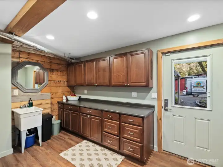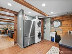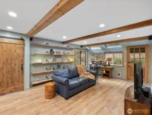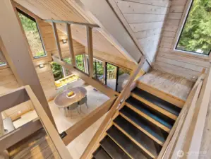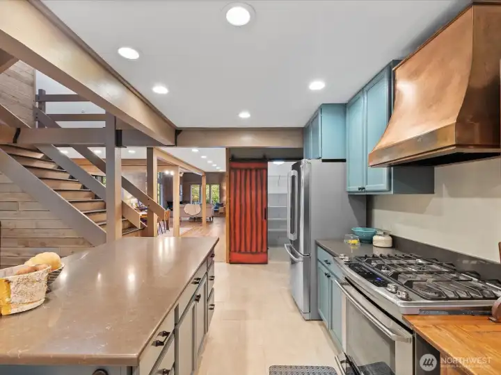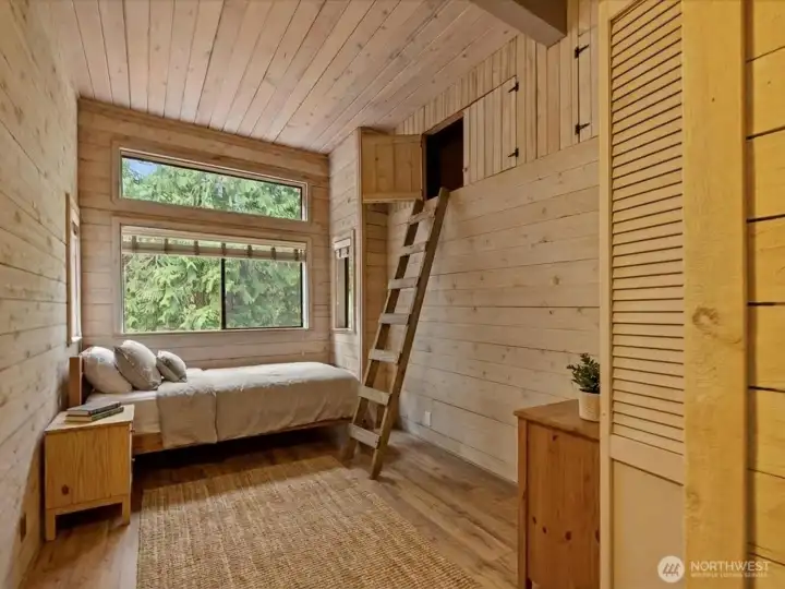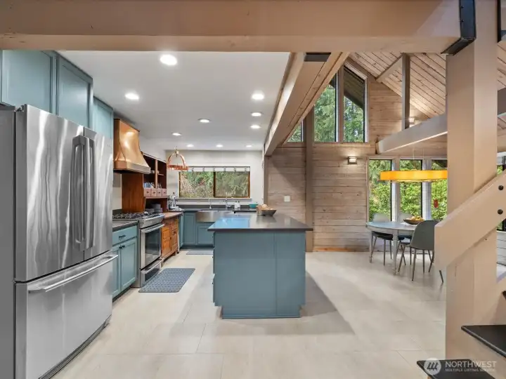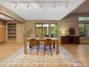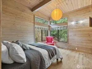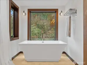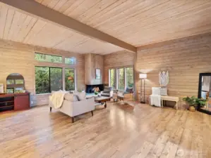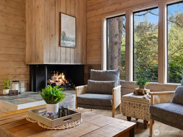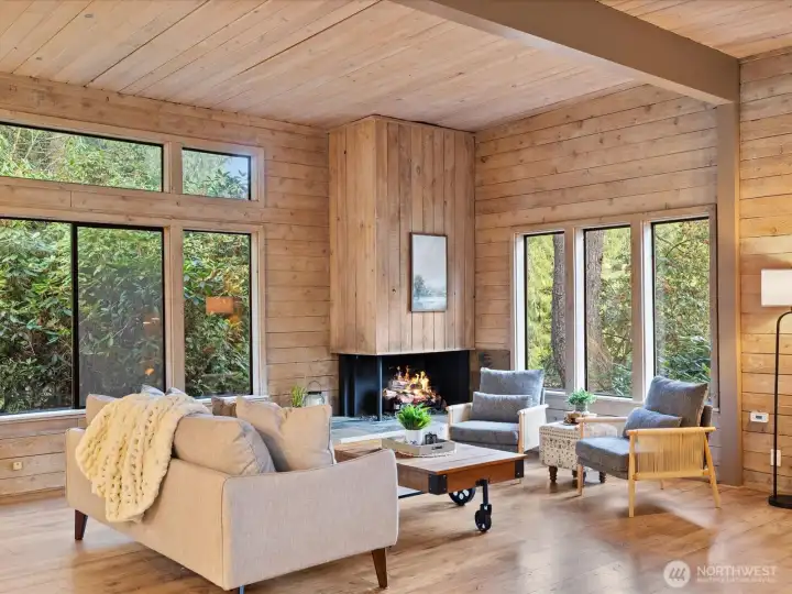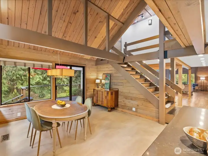 This stunning home features a very spacious living room with soaring ceilings, expansive windows, and cozy wood-burning fireplace, perfectly positioned next to the dining area; ideal for everyday living & entertaining. The updated chef-inspired kitchen showcases a professional-grade range, oversized island, walk-in pantry, dedicated eating space & heated floors. The kitchen dining area opens to a spacious deck & gardens, ideal for gatherings. The main level also includes a generous mudroom w/laundry, utility sink, extra refrigerator, nearby ¾ bath, & TV room w/ built-in shelving.Thoughtfully designed with a Frank Lloyd Wright–inspired influence, the home emphasizes natural light, connection to the outdoors, and timeless architectural character. Two original windows from the historic Seattle Times building add unique provenance & charm.Upstairs offers three bedrooms, two full baths, & flexible library or office space w/ built-in cabinetry. The primary suite is a true retreat with multiple closets and a spa-inspired five-piece bath - freestanding soaking tub, oversized walk-in shower w/ rainfall fixture, double vanity, dramatic high ceilings w/ oversized windows. Nestled among mature trees, a peaceful babbling brook, established gardens, this serene retreat sits on nearly 2.5 acres with pastures, a 6-stall barn, direct access to Redmond Watershed’s 800+ acres of trails. The property is designated as a Backyard Wildlife Sanctuary by the Washington Department of Fish & Wildlife.