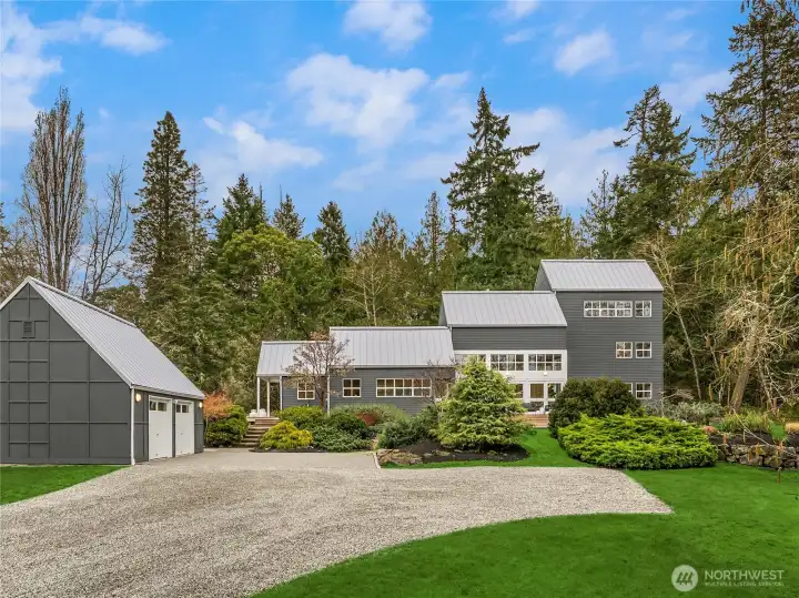 This exceptional home is a work of art-where modern design meets enduring comfort. Recently and thoughtfully renovated with substantial investment, every improvement reflects the guidance of trusted experts and a meticulous commitment to quality. A striking gabled roofline and beveled siding blend seamlessly with expansive walls of glass and soaring ceilings, creating an airy, light-filled interior that feels at once dramatic and welcoming. Endless windows frame nature at every turn, offering the extraordinary sensation of being outdoors while enjoying the comfort of home. Sunlight streams through silhouetted trees, transforming each room throughout the day. The open-concept living spaces are both refined and functional. Exposed white-painted trusses draw the eye upward, while southern light floods the interiors. French doors extend the living room onto a spacious deck, creating effortless indoor-outdoor flow-perfect for entertaining or quiet mornings immersed in nature. Thoughtfully designed 2/Bedrooms; 2/Baths; mezzanine-level office & treetop bonus room. Polished wood floors and gallery-white walls enhance the home's clean, functional aesthetic-designed for both beauty and ease of maintenance. Set on a private, sun-soaked 1.79-acre lot with a two-car garage, ideally located on the southern tip of Bainbridge Island, moments from Pleasant Beach Village, Fort Ward Park, and Lytle Road beach access, this home offers rare tranquility with convenient access to island amenities.