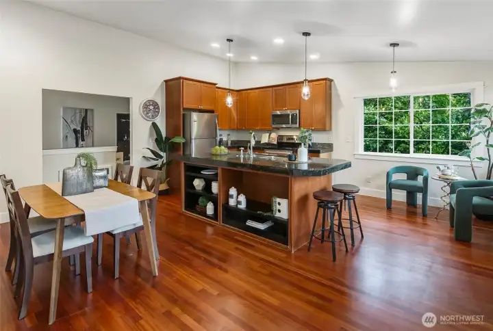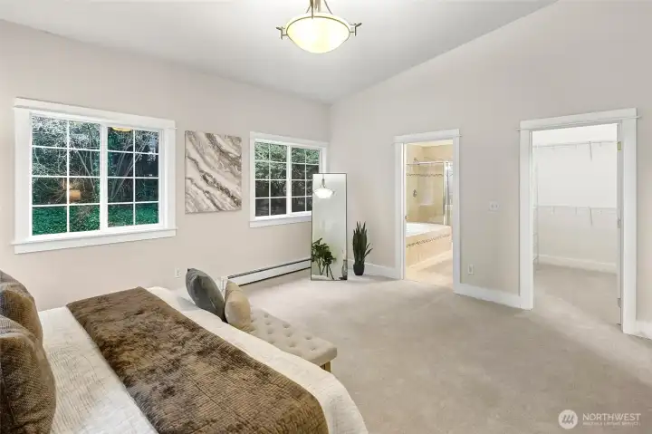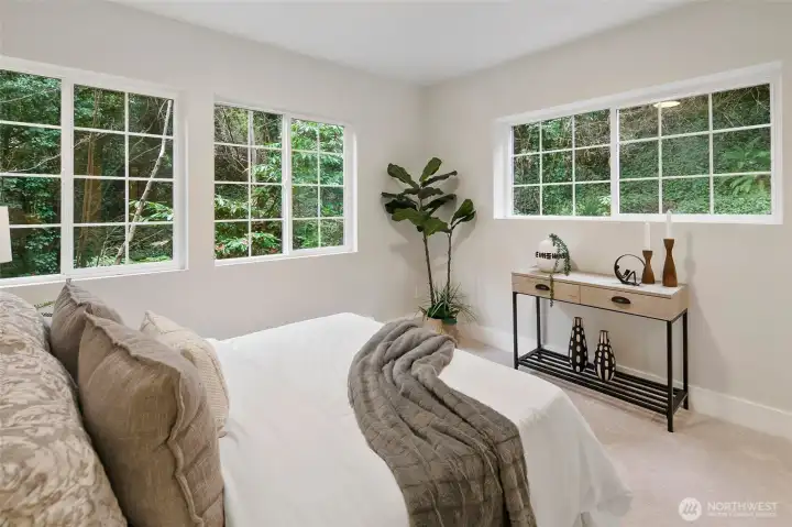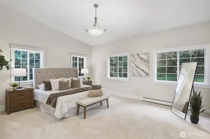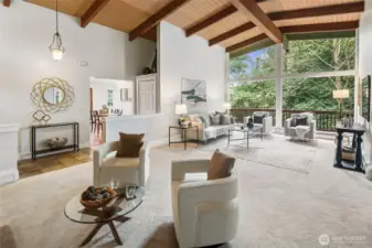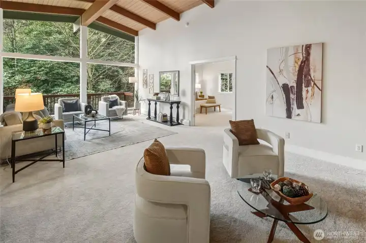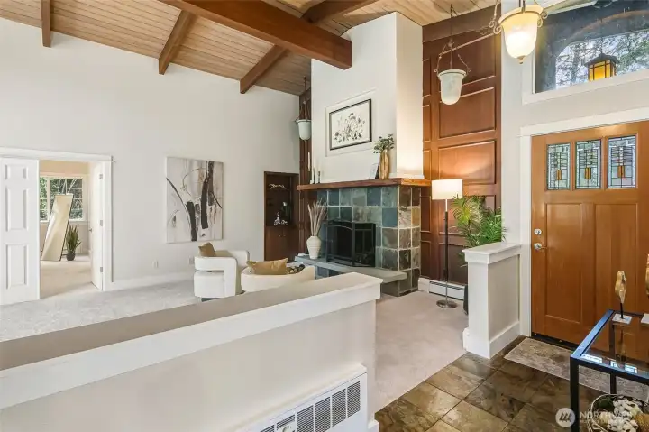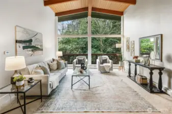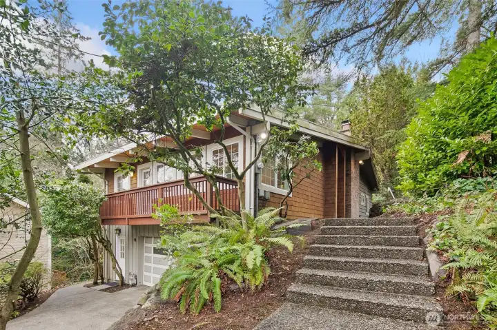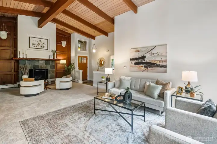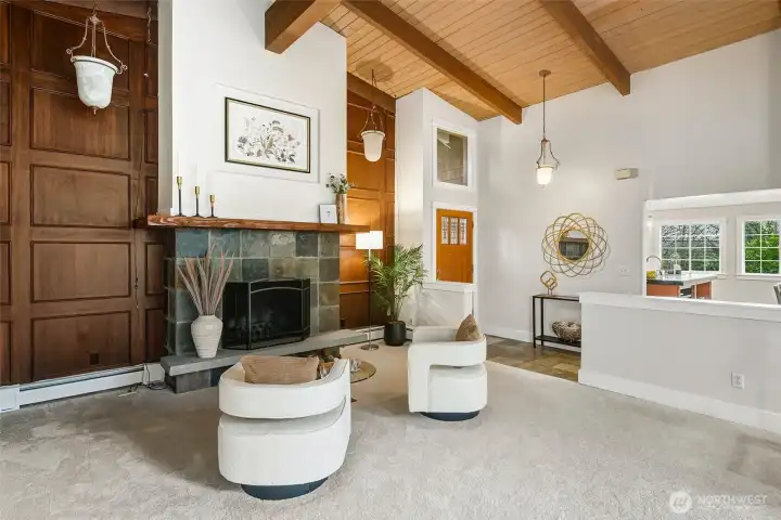 Stunning Victory Heights retreat offering exceptional space, light, and privacy across two thoughtfully designed levels. Dramatic tall ceilings with exposed wood beams and a statement fireplace anchor the main living area, creating a warm yet architectural focal point. Walls of windows frame tranquil territorial tree views with peekaboo Cascade glimpses, bringing the outdoors in year-round. The expansive primary suite is a true sanctuary, featuring a generous walk-in closet and a luxurious five-piece bath. A dedicated office with vaulted ceilings and its own private deck provides an ideal work-from-home escape. Spacious secondary bedrooms and a large rec room offer flexibility for guests, play, or media. Multiple private decks extend the living space outdoors, while the tiered backyard offers privacy, usable outdoor areas, and convenient access from the back road. A long driveway provides ample off-street parking in addition to the two-car garage. Fantastic location close to light rail, parks, top-rated schools, shopping, and dining, with easy access to I-5 and downtown Seattle. A rare combination of space, privacy, architectural character, and convenience in one of North Seattleās sought-after neighborhoods.