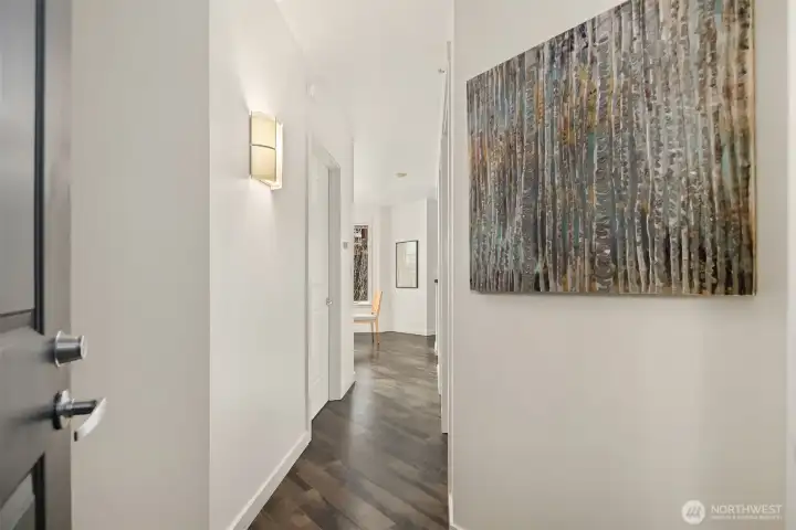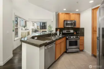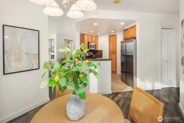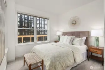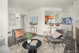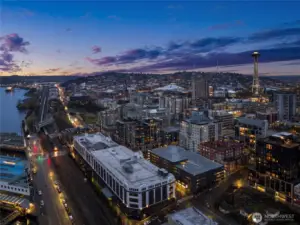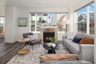 This modern 2-bedroom, 1.5-bath home at the The Vine Condominiums is situated on the northeast corner of the 5th floor and offers charming downtown city views throughout. Spacious and thoughtfully designed, the well-appointed floor plan features a formal entryway; a gourmet kitchen with maple cabinetry, granite tile countertops, and stainless steel appliances; a designated dining area; and an open living room with a gas fireplace, wall-to-wall windows, and a private covered balcony. The home also includes a generously sized primary bedroom with a walk-in closet, a versatile second bedroom, and a full bathroom with tub, and convenient powder room. Additional highlights include plush carpet, high ceilings, fresh paint throughout, updated LVP flooring, abundant year-round natural light, and ample closet space. The Vine Condominiums is located in the heart of Belltown, within walking distance of top restaurants, shops, and entertainment, as well as iconic destinations like Pike Place Market, the Olympic Sculpture Park, and Climate Pledge. Residents enjoy 24-hour concierge service, a rooftop deck with stunning city and Sound views, a fully equipped resident lounge, furnished guest suites, a large fitness center, and secure underground parking with car wash and storage.