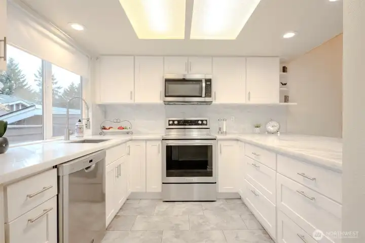 Enjoy serene golf course views from this beautifully updated condo. The home features two spacious bedrooms, both with private balconies and vaulted ceilings. The primary suite boasts a remodeled bathroom with quartz countertops, a walk-in shower, and a walk-in closet.The light and bright kitchen offers quartz counters, upscale newer appliances, soft-close cabinetry, an eating bar, and a pantry. The dining room and adjoining living room showcase vaulted ceilings, a ceiling fan, a cozy fireplace, and a large picture window overlooking the golf course.Additional highlights include newer hardware and flooring, plus a one-car garage. This is truly a place to call home.