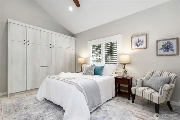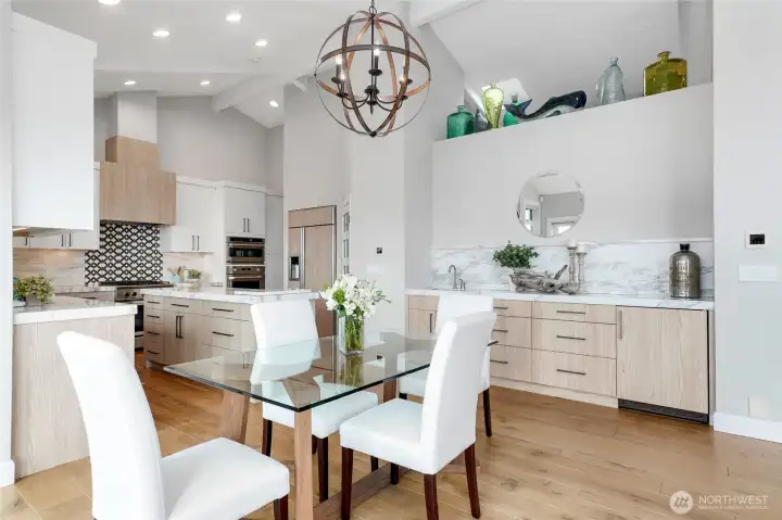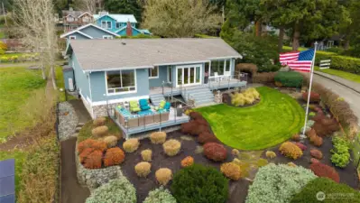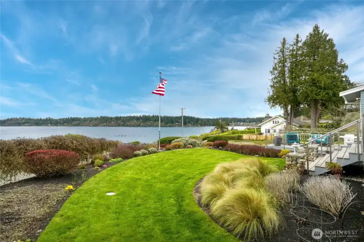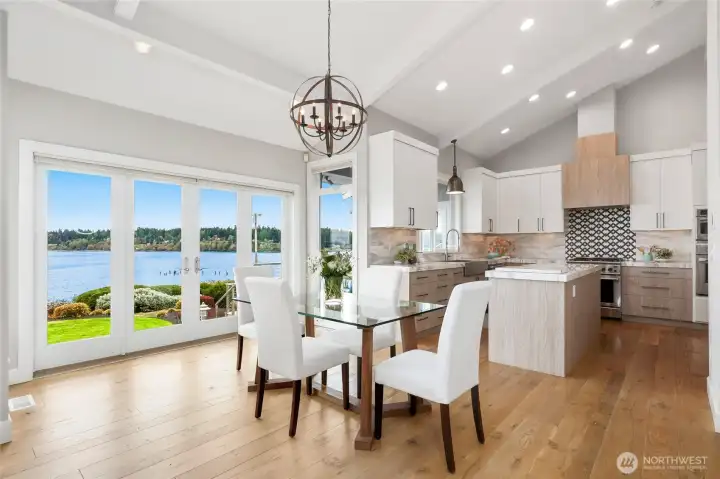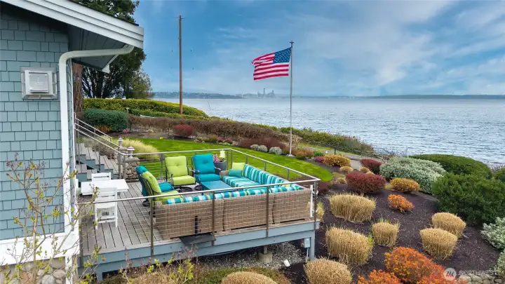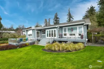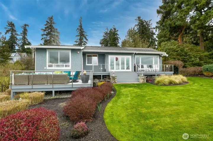 Refined Northwest living with sweeping southeastern Puget Sound, Seattle skyline and Mt. Rainier views from nearly every primary space, including the main-floor primary suite. Ideally located just steps to Manitou Beach, a short stroll to Rolling Bay’s cafés, boutiques, wineries and artisan studios, and less than 10 minutes to the ferry. Set on just shy of half an acre with 100 ft of waterfront, this light-filled home pairs vaulted ceilings, skylights and walls of windows with beautifully upgraded, low-maintenance landscaping designed for year-round interest. The main level is designed for effortless everyday living and entertaining, with the kitchen, dining and living areas flowing seamlessly together around the view. A gas fireplace anchors the living room, while the dining area opens directly to the deck for easy indoor-outdoor connection. The built-in bar/beverage station and chef’s kitchen with Calacatta Gold marble, premium appliances and walk-in pantry support both casual living and gatherings with ease. The main-floor primary is a true retreat with panoramic views, deck access, fireplace and a fully renovated spa bath with heated floors, soaking tub, walk-in shower and dual vanities. Two additional ensuite bedrooms, two office/flex rooms, multiple view decks, fenced outdoor living, dual HVAC, whole-house generator and attached 2-car garage complete this exceptional Bainbridge Island offering.