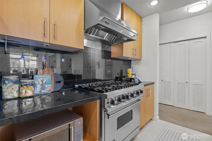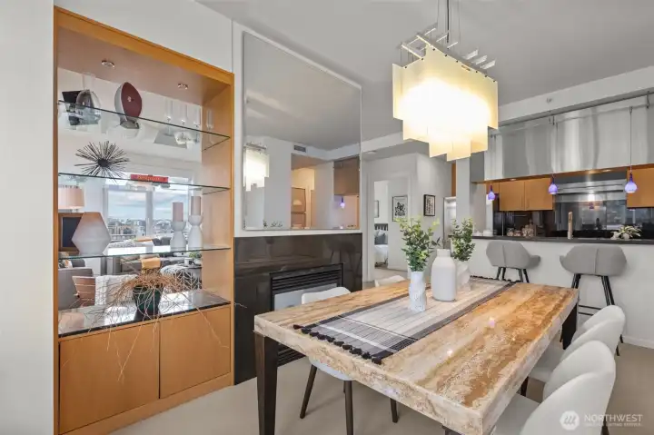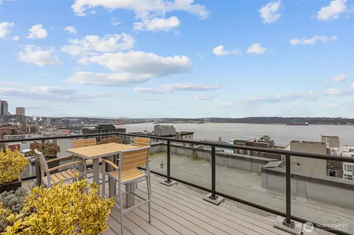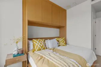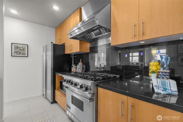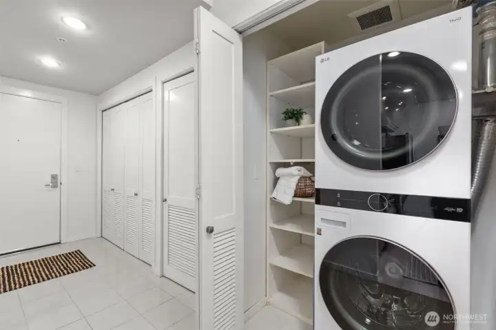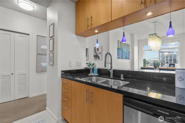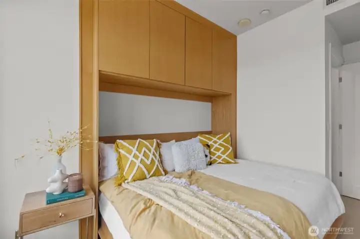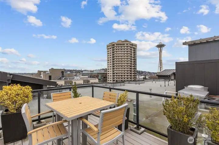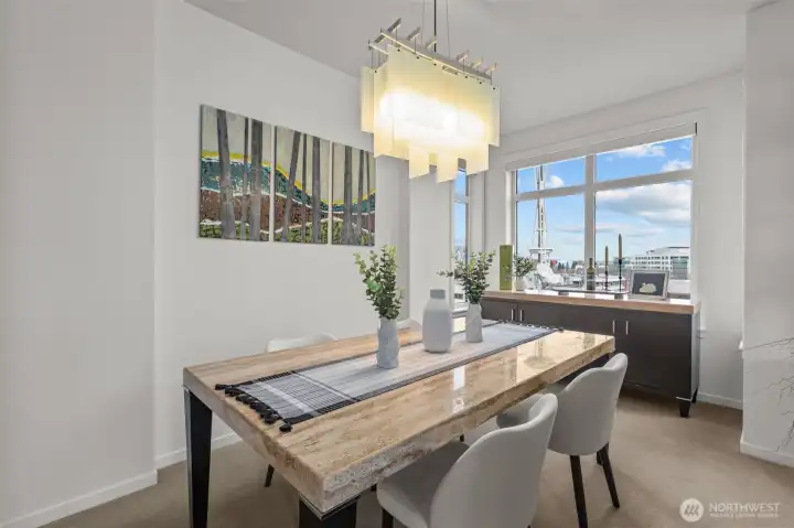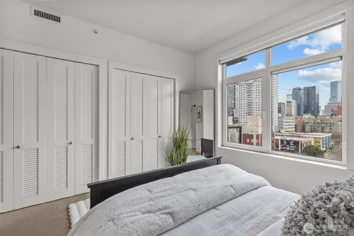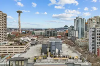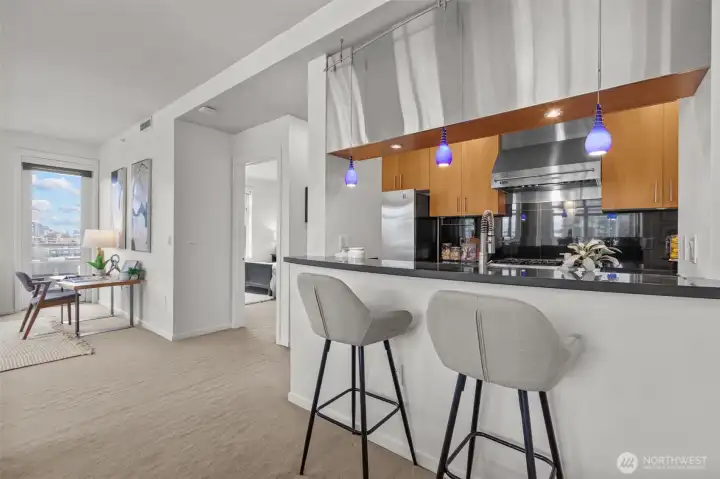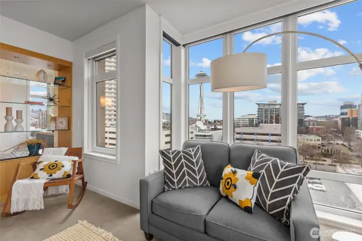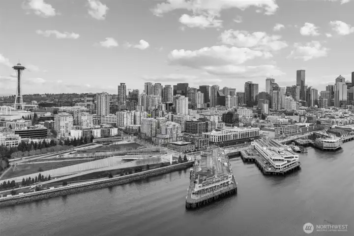 Own Iconic Space Needle views from this 10th-floor, 2-bedroom residence in sought-after Avenue One. Ideally located within walking distance to downtown, and the new waterfront park, this home offers the best of city living while providing a peaceful retreat from the street below. The open-concept layout is filled with natural light and features a gourmet kitchen with Viking gas range, stainless steel appliances, and slab granite countertops. Open concept living space, ideal for entertaining. The primary suite includes California Closets, while the second bedroom offers flexibility with a Murphy bed and built-in desk. Additional features include central A/C, in-unit laundry, storage, and 2 secure parking spaces. Full-service building amenities include concierge, club room, fitness center, guest suite, and a rooftop deck with panoramic city and water views.